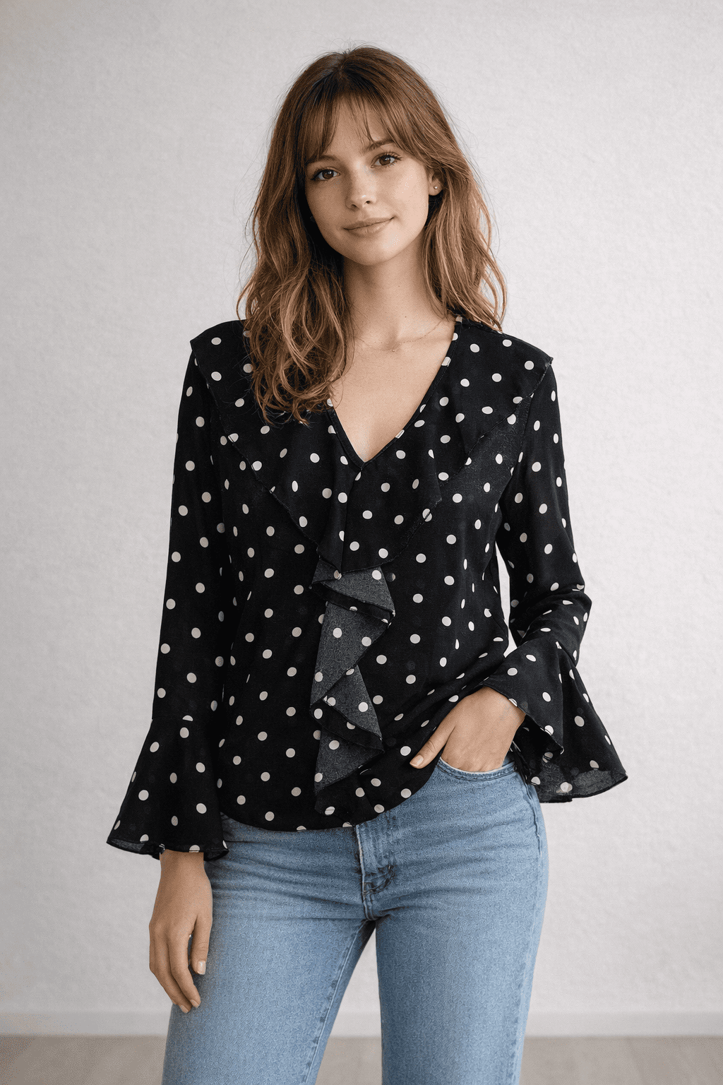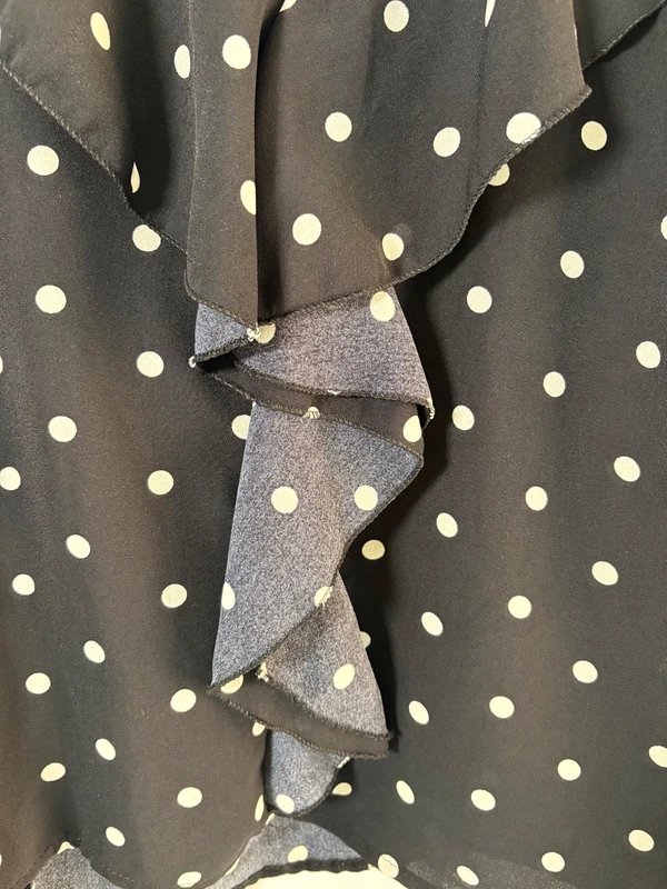 Blouse à pois volant cascade, noir, col V, manches évasées