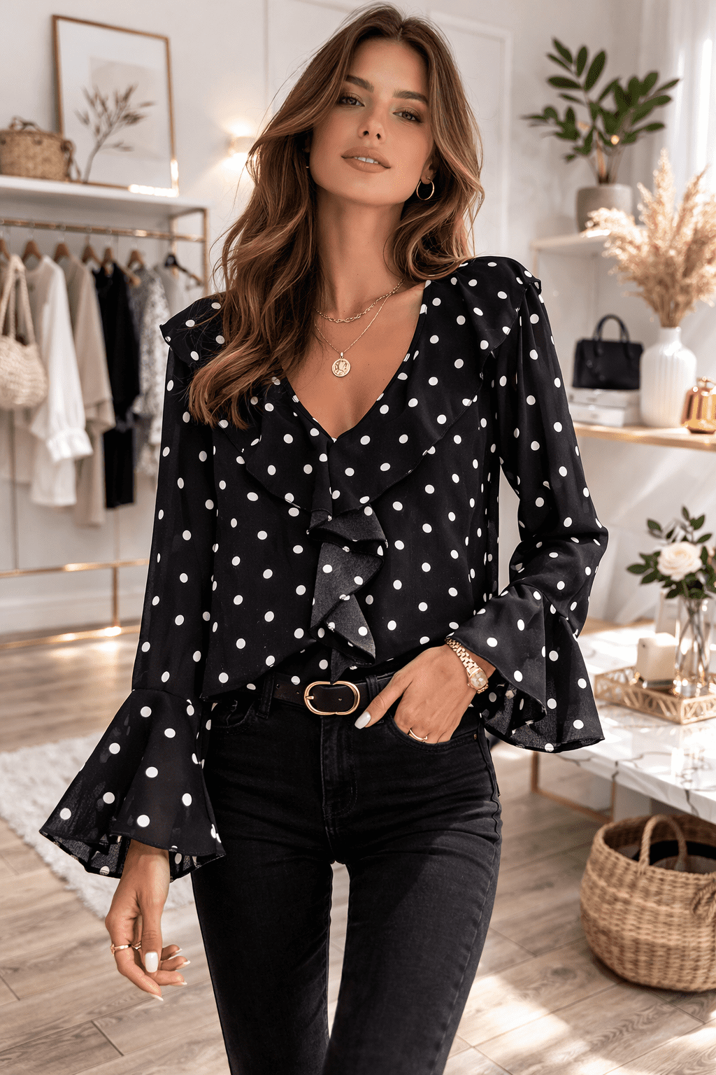 Une blouse noire à pois, fluide et élégante.