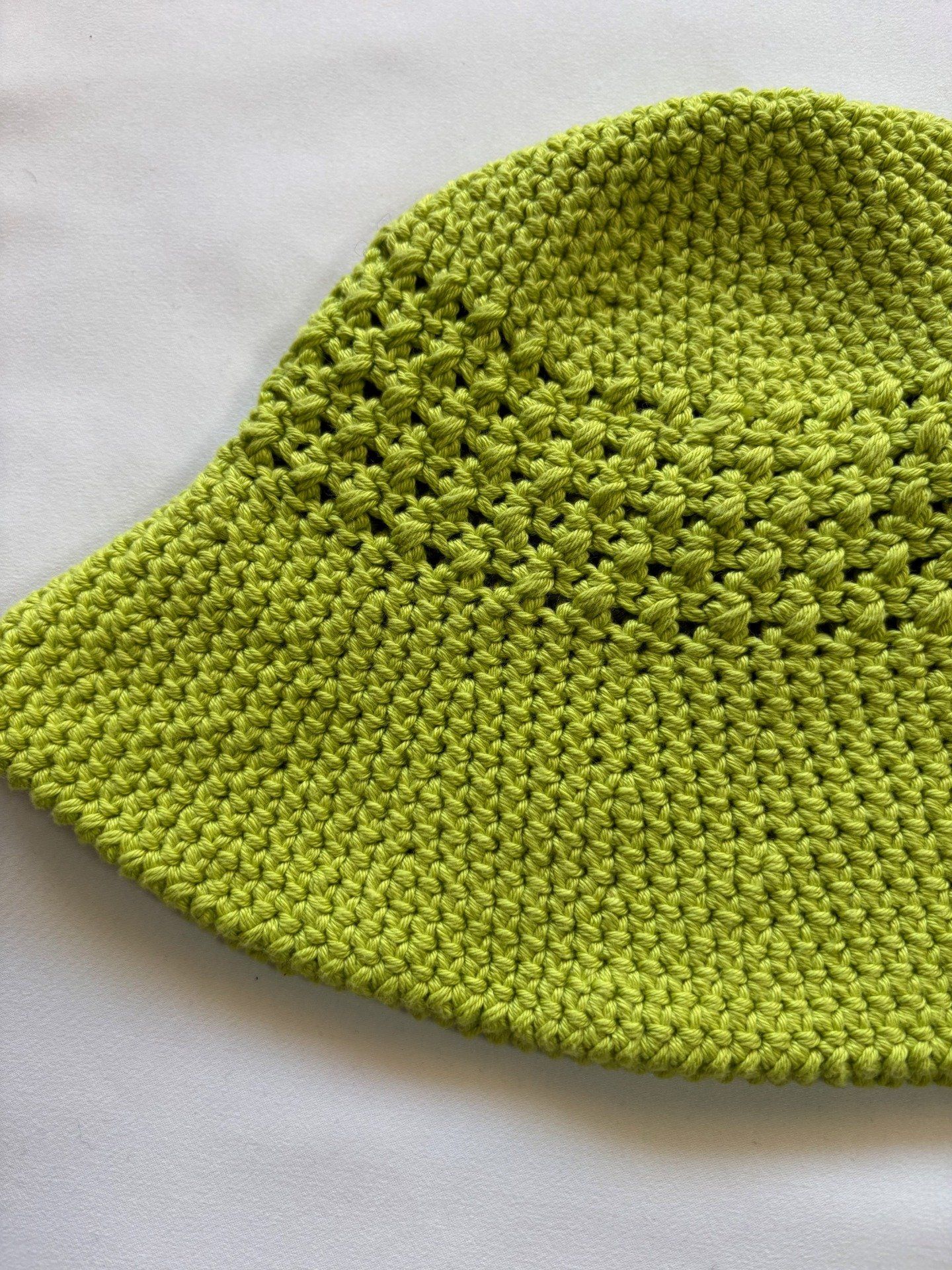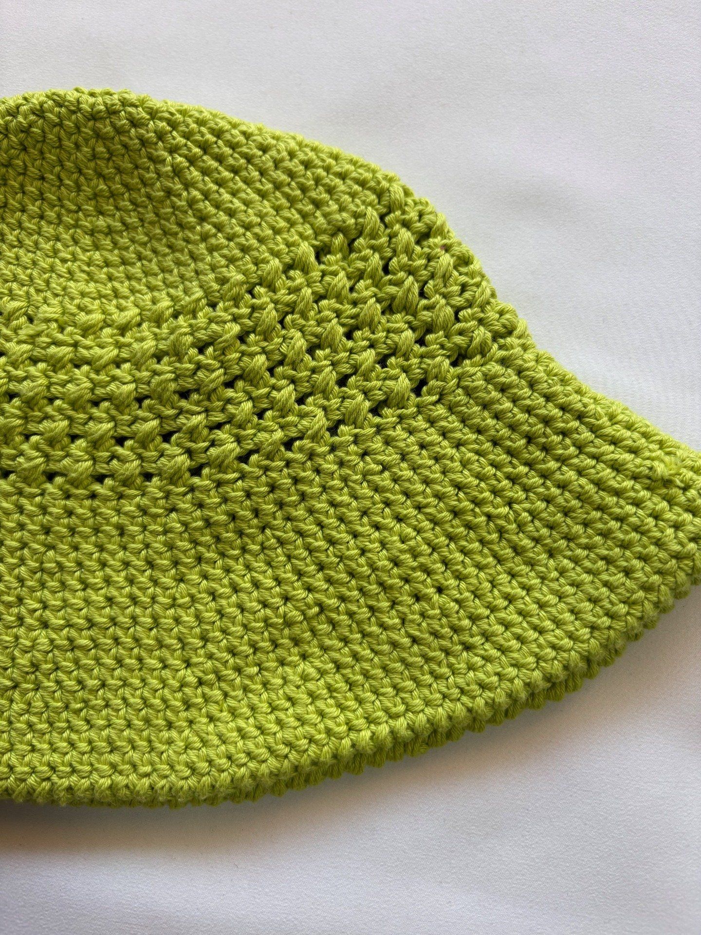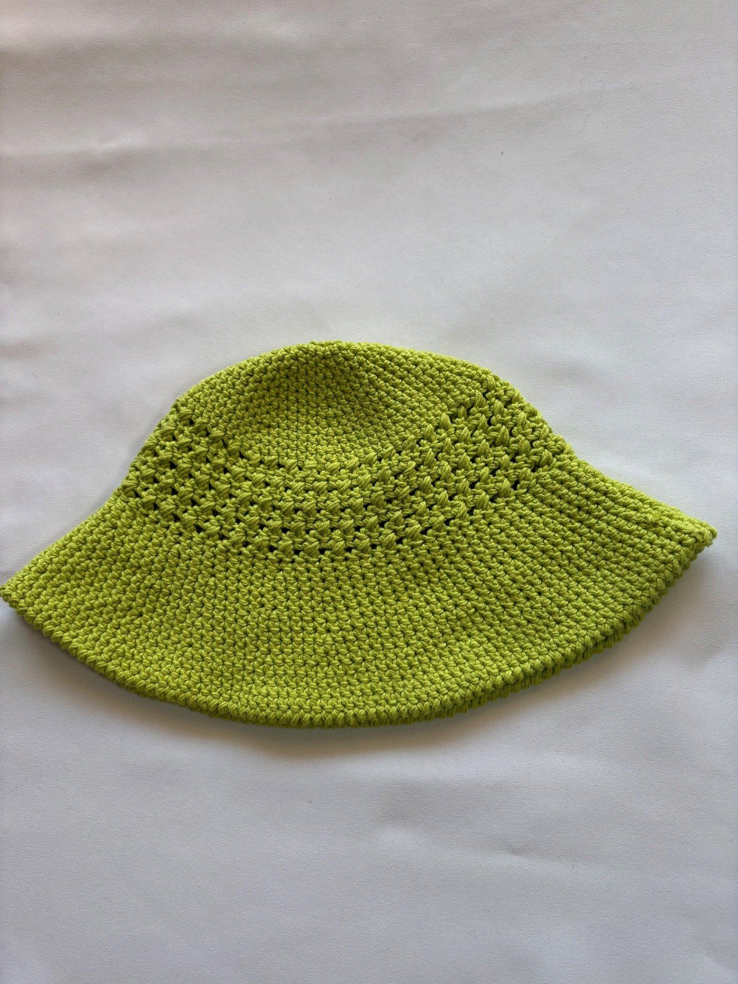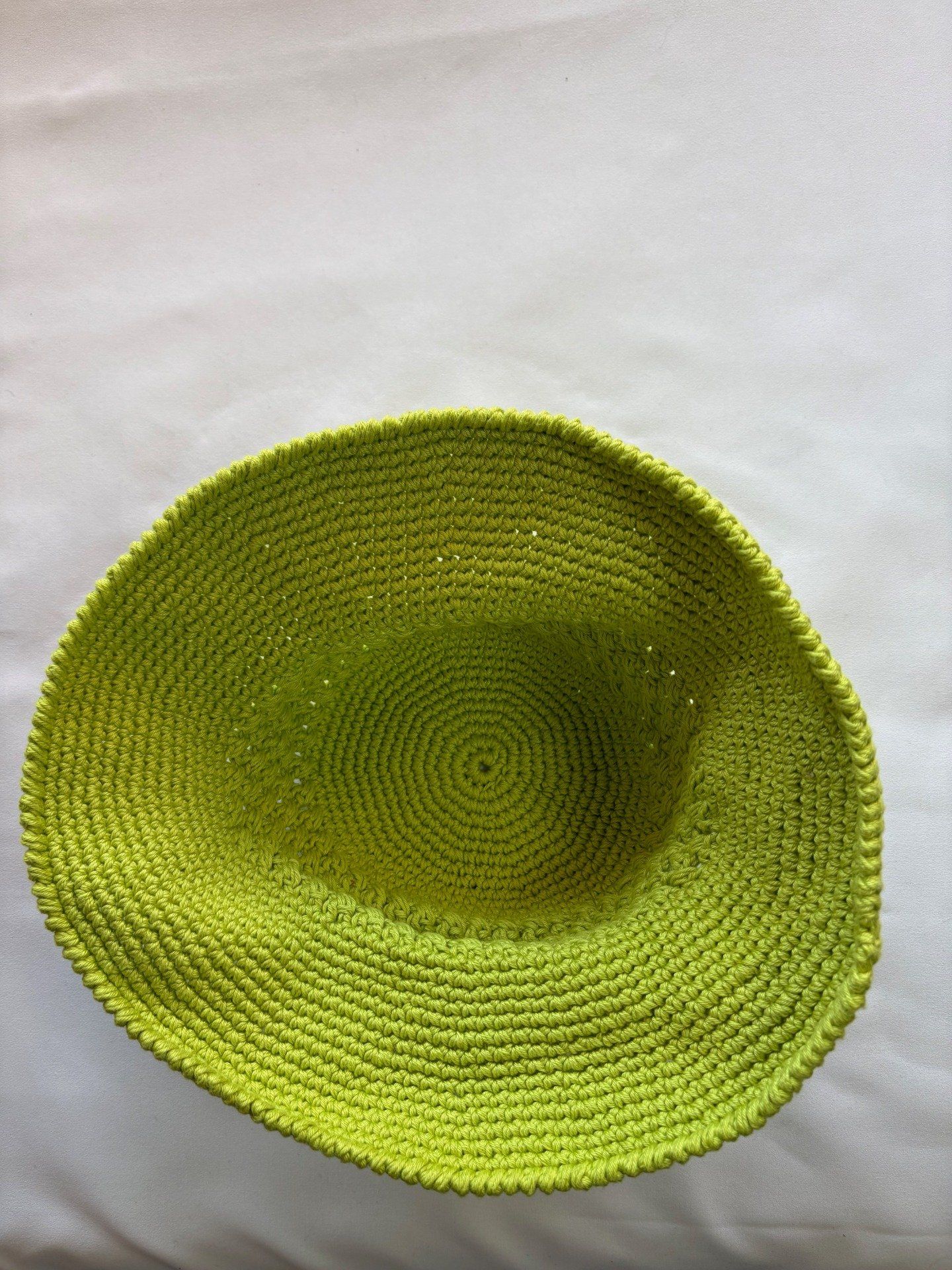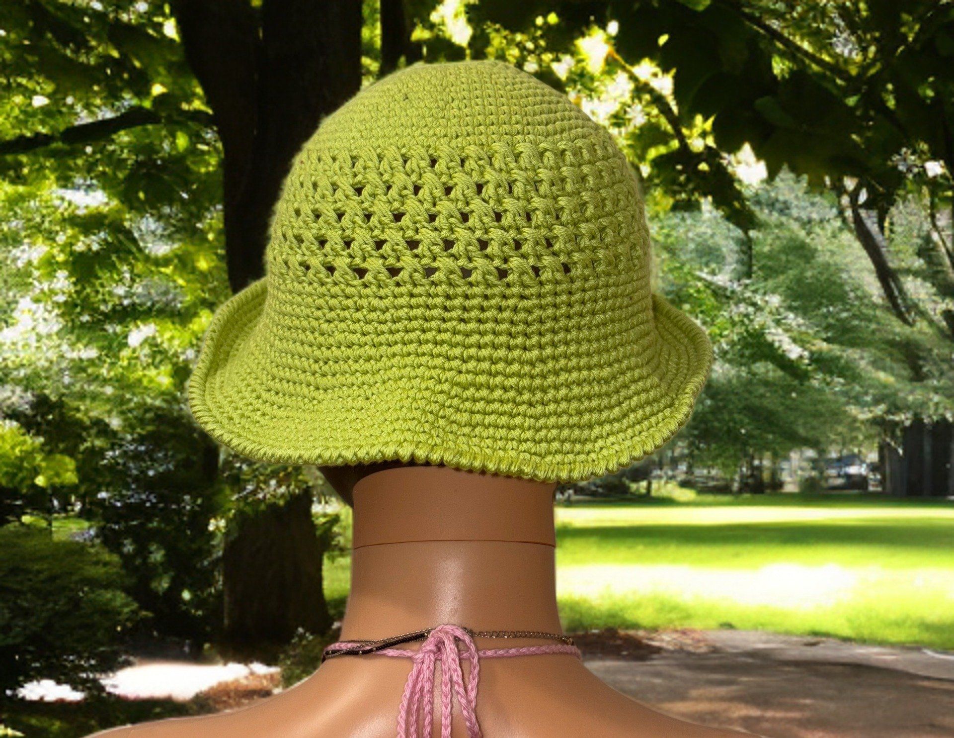 Bob / chapeau au crochet fait main, vert anis lumineux, maille ajourée. Confortable pour la belle saison, facile à porter au quotidien.