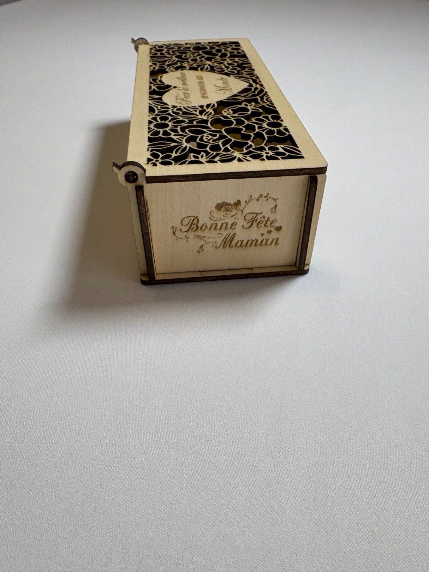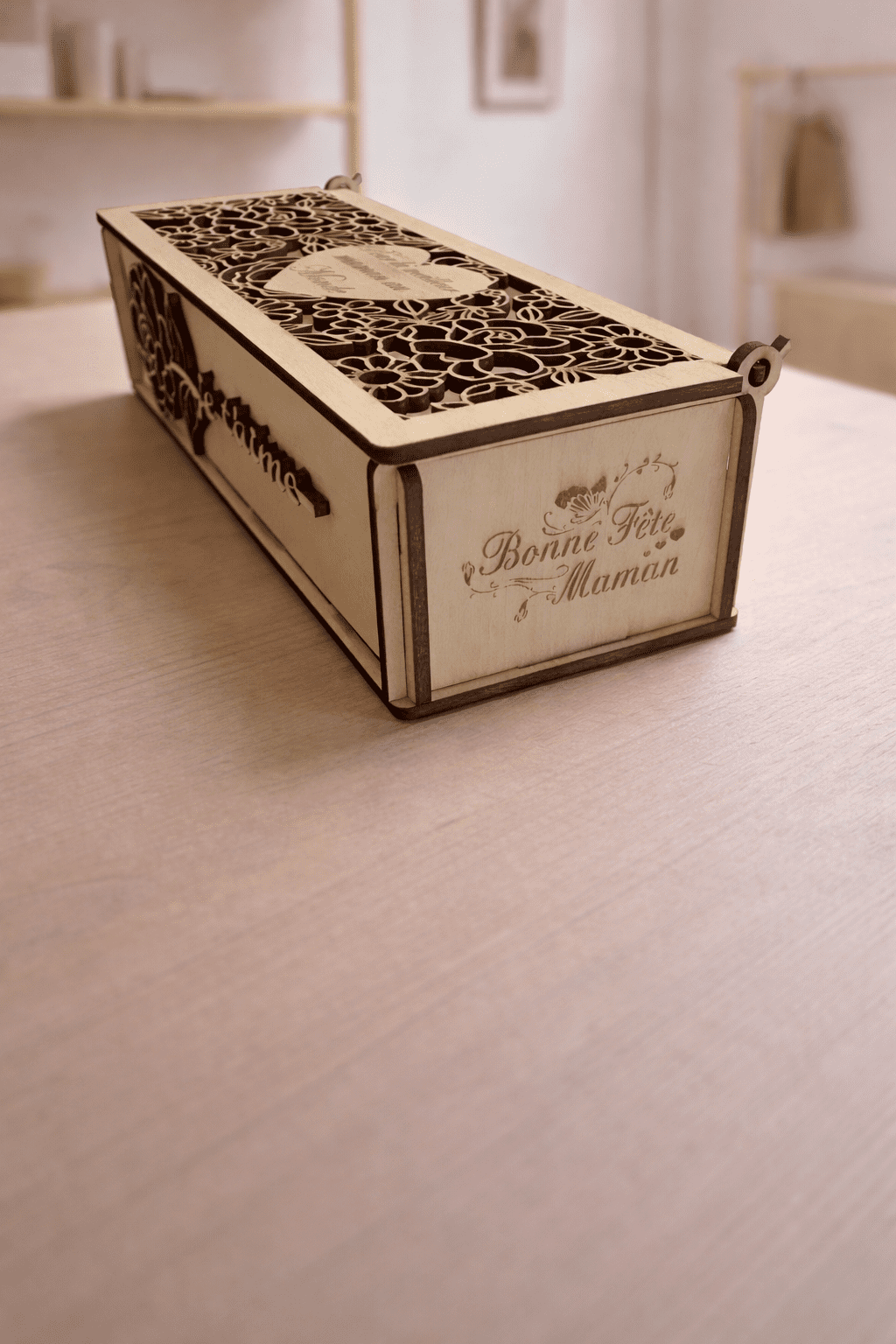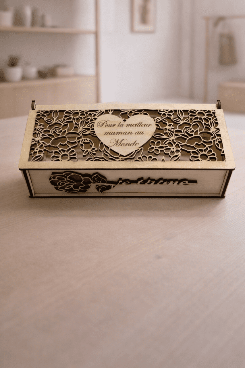 Une jolie boîte en bois au style tendre et décoratif, pensée pour offrir un petit cadeau ou accompagner une attention spéciale pour la Fête des Mères.