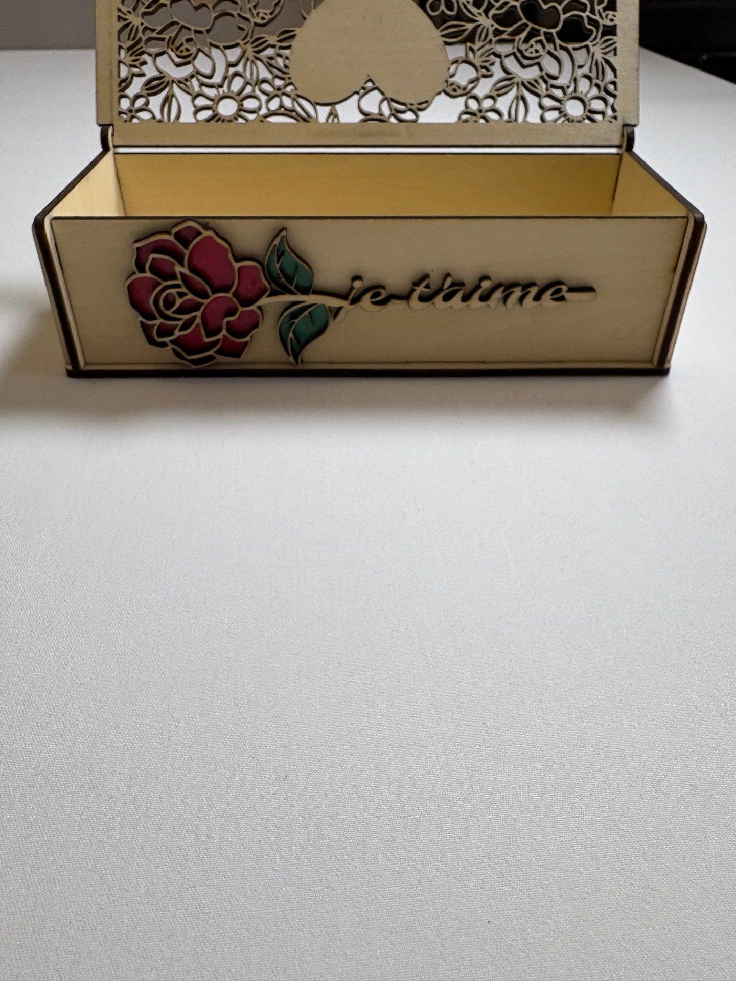 Cette boîte cadeau en bois allie simplicité, douceur et finition décorative. Réalisée en bois tilleul, elle présente un couvercle ajouré à motifs floraux ainsi que plusieurs éléments décoratifs visibles sur les photos, dont les mentions “Bonne Fête Maman”, “Pour la meilleure maman au Monde” et un décor floral avec rose et “je t’aime” en façade.
