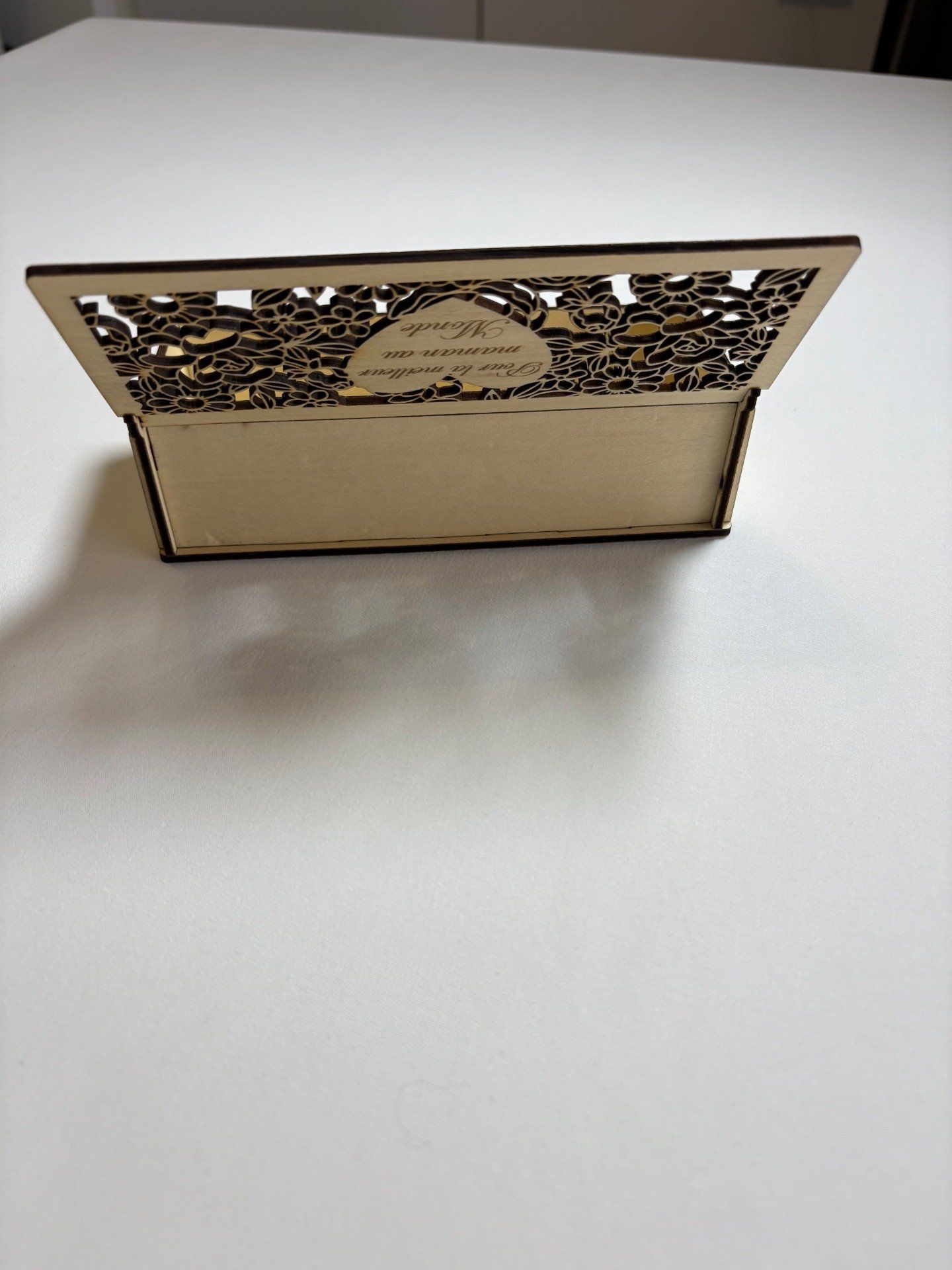 Son format 18 × 7 × 5 cm la rend idéale pour présenter une petite attention, compléter un cadeau ou simplement servir d’objet décoratif. Son aspect naturel en bois clair, associé aux contours brunis typiques de la gravure et de la découpe laser, lui donne un rendu chaleureux et soigné.