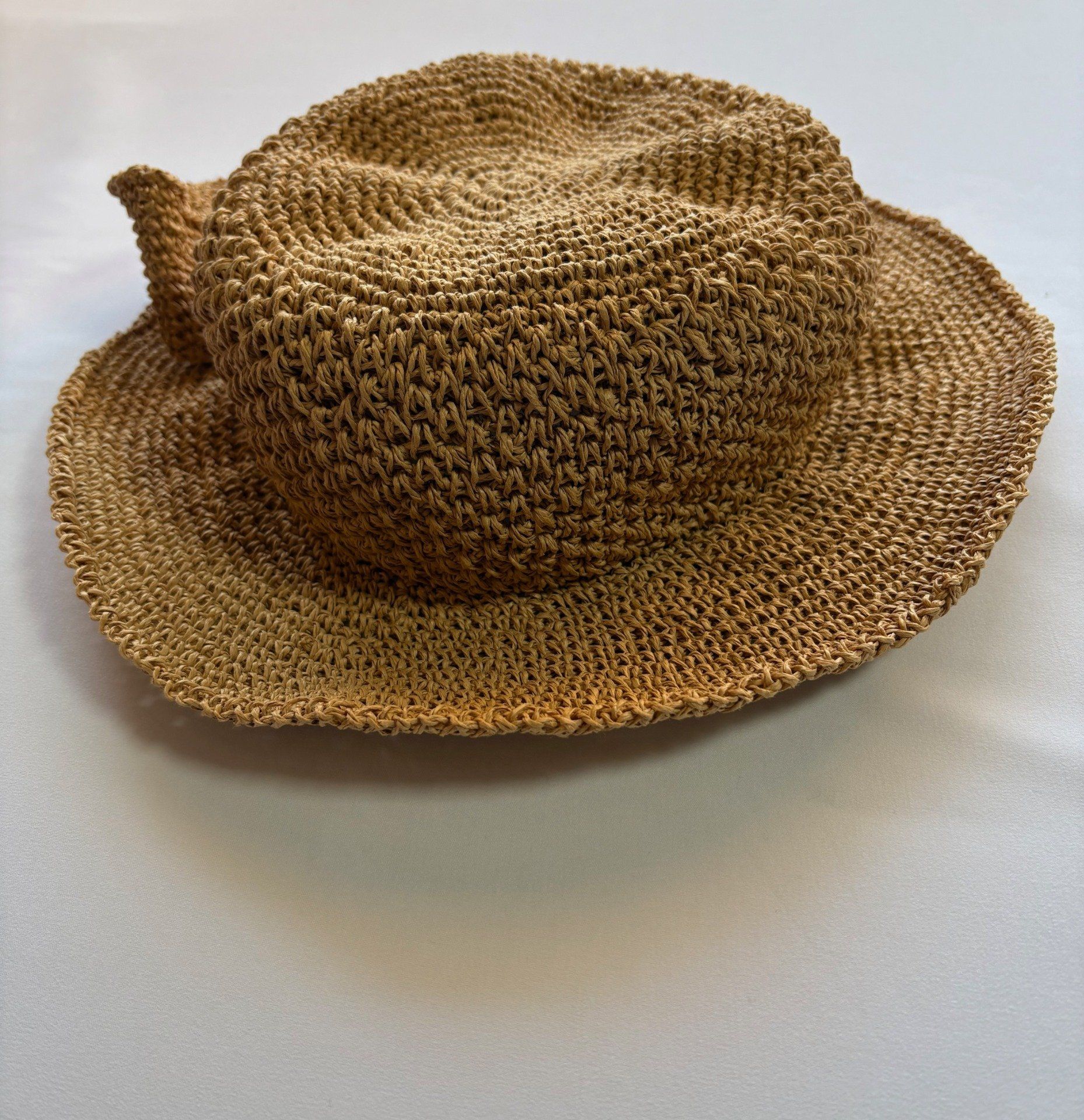 Un chapeau en raphia naturel, au crochet tressé.