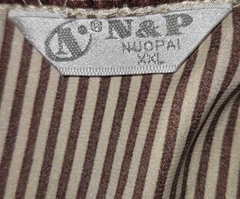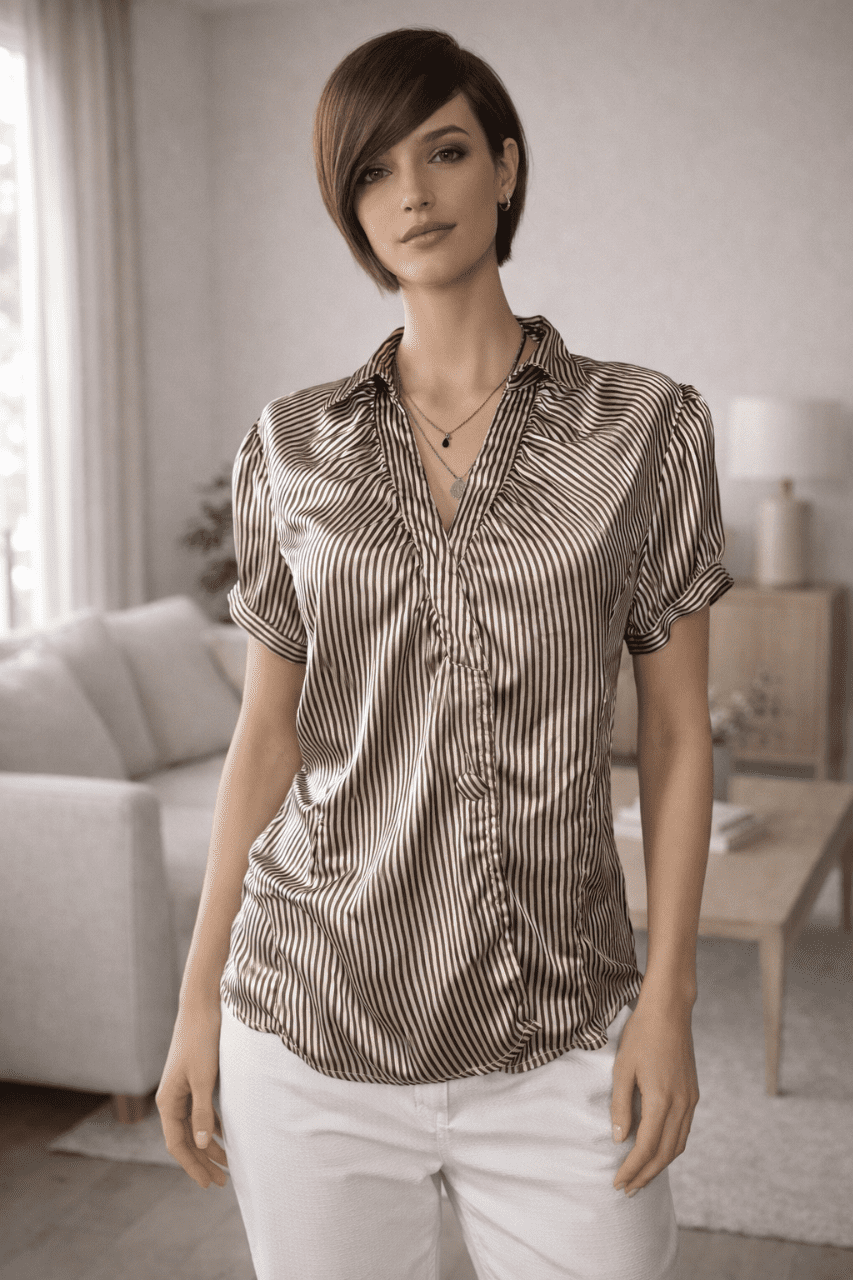Chemisier femme effet satiné à rayures verticales marron & crème, col chemise et manches courtes à revers. Look chic facile (bureau/soirée). Seconde main : pièce unique, photos réelles. Réf. 80BLZ.