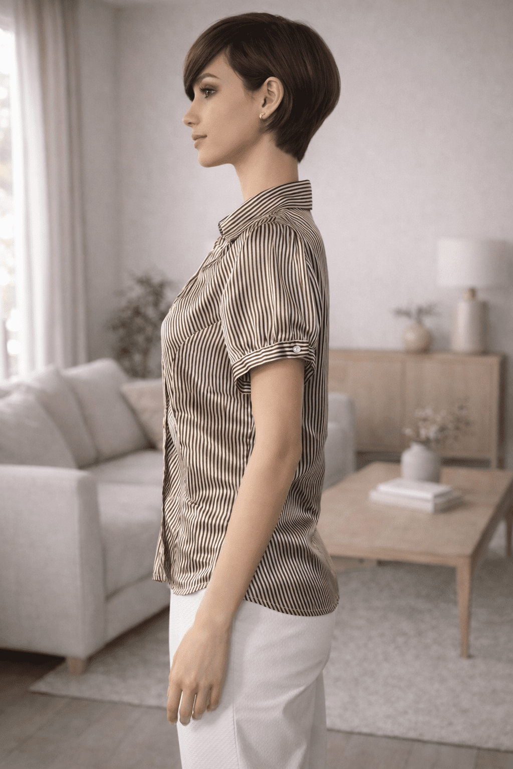 Chemisier femme effet satiné à rayures verticales marron & crème. Col chemise et manches courtes à revers : une pièce chic facile à porter. Composition premium : 40% soie / 60% viscose.