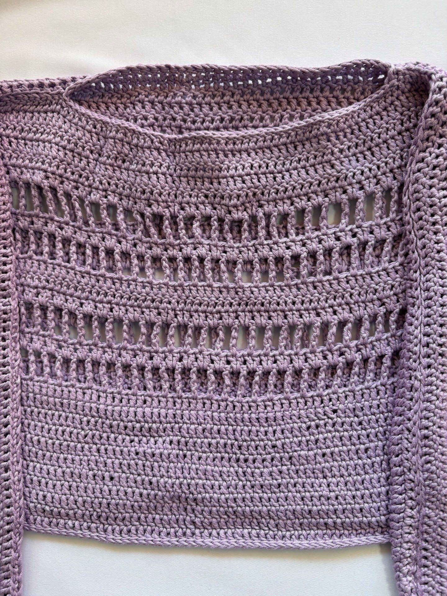 Crop-top au crochet lavande, motif ajouré et manches amples. Coupe courte, allure légère, facile avec un short ou une jupe taille haute. Taille FR 36/38 (S/M). 80% acrylique, 20% laine.