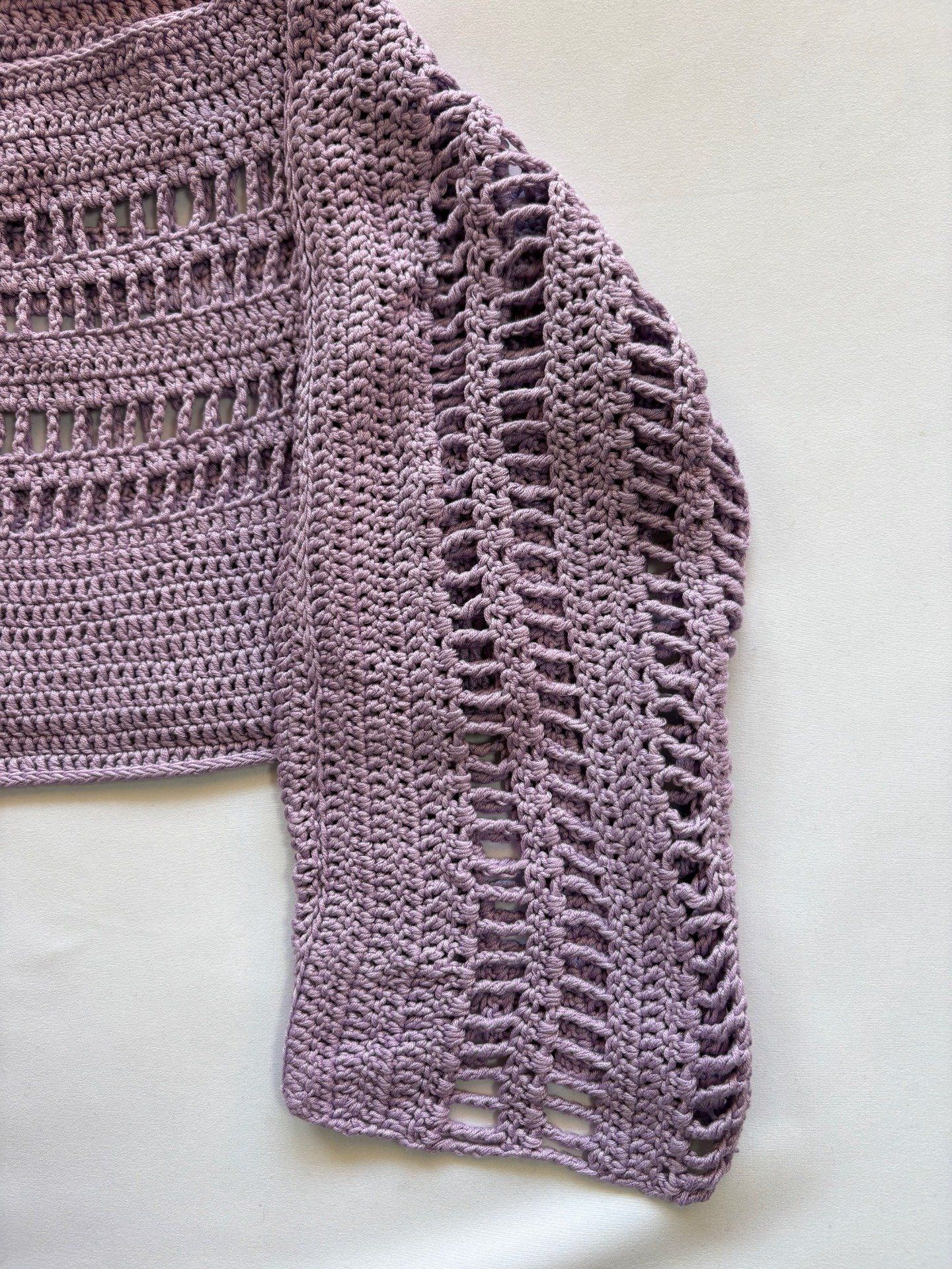 Crop-top crochet lavande ajouré, manches amples