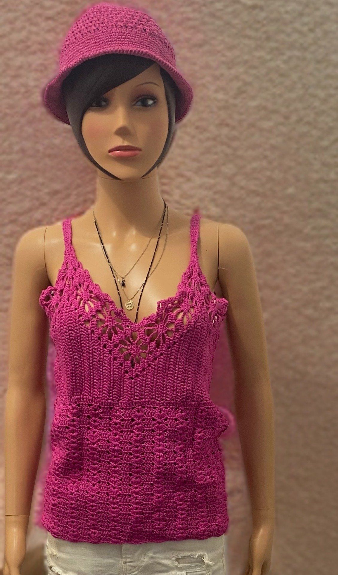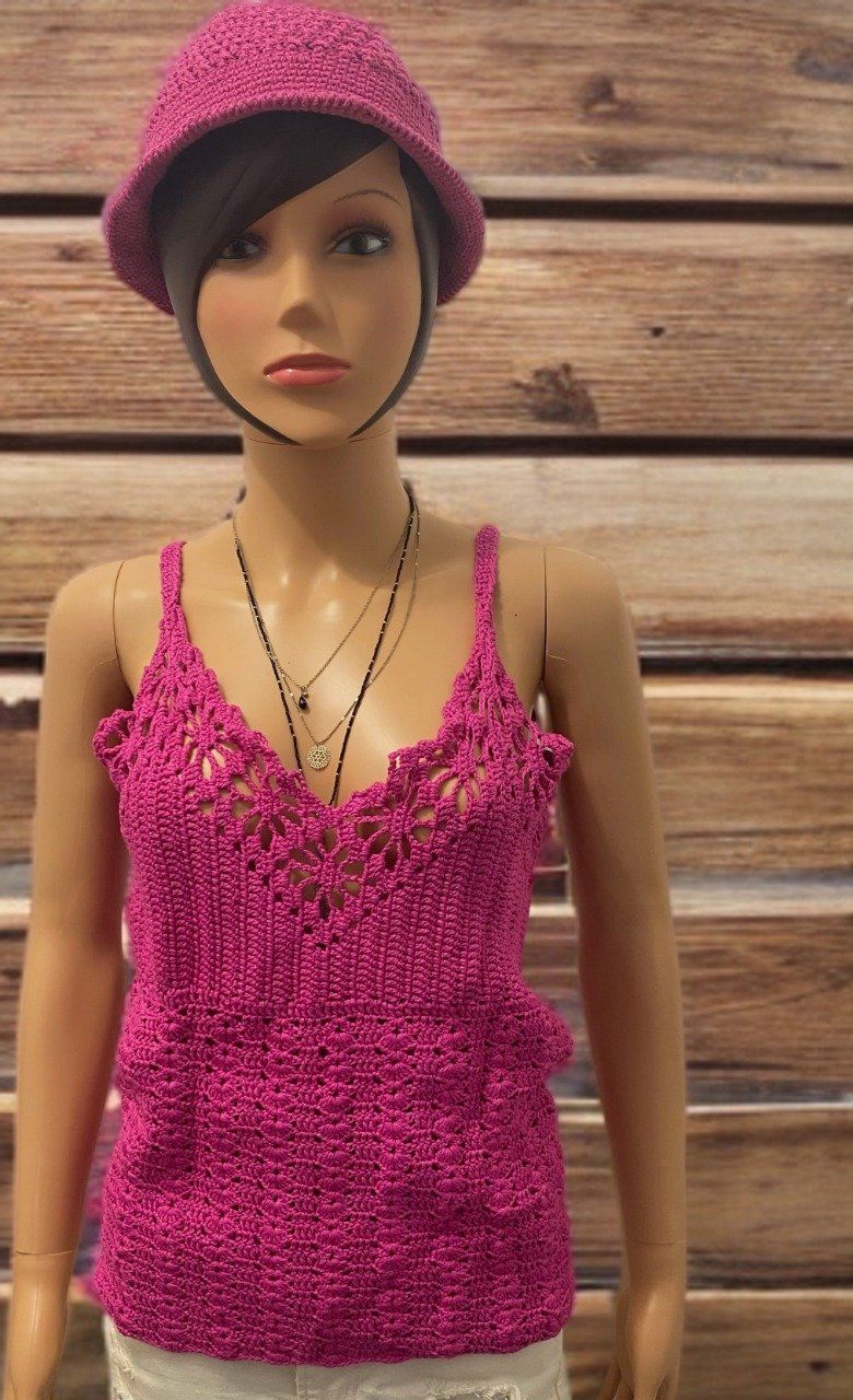 Débardeur femme en crochet fait main, coloris rose fuchsia. Léger, féminin et élégant, il met en valeur la silhouette avec son motif ajouré et ses fines bretelles. Idéal pour la belle saison.