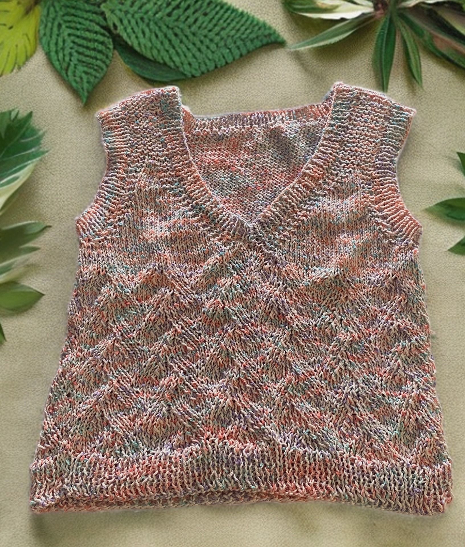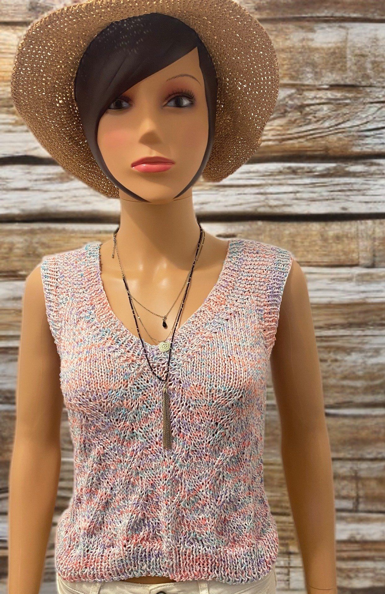 Débardeur femme en maille chinée multicolore pastel, col V et coupe droite. Doux, léger, facile en mi-saison ou l’été, seul ou en superposition. Taille FR 36/38 (S/M)
