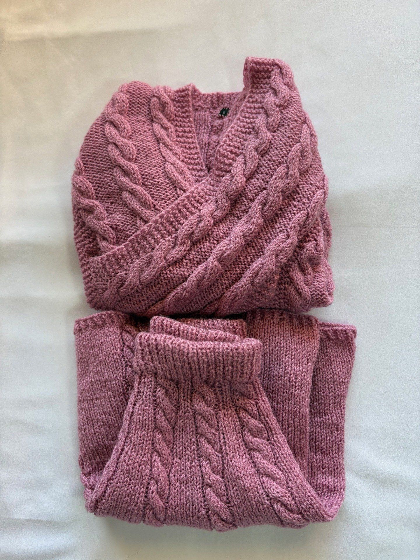 Ensemble jupe + pull torsadée rose poudré, maille raffinée