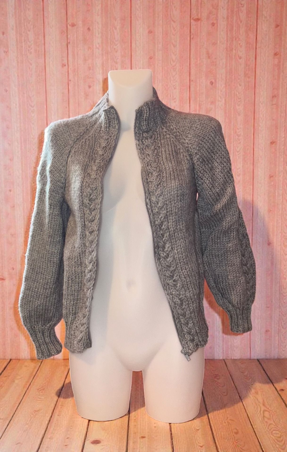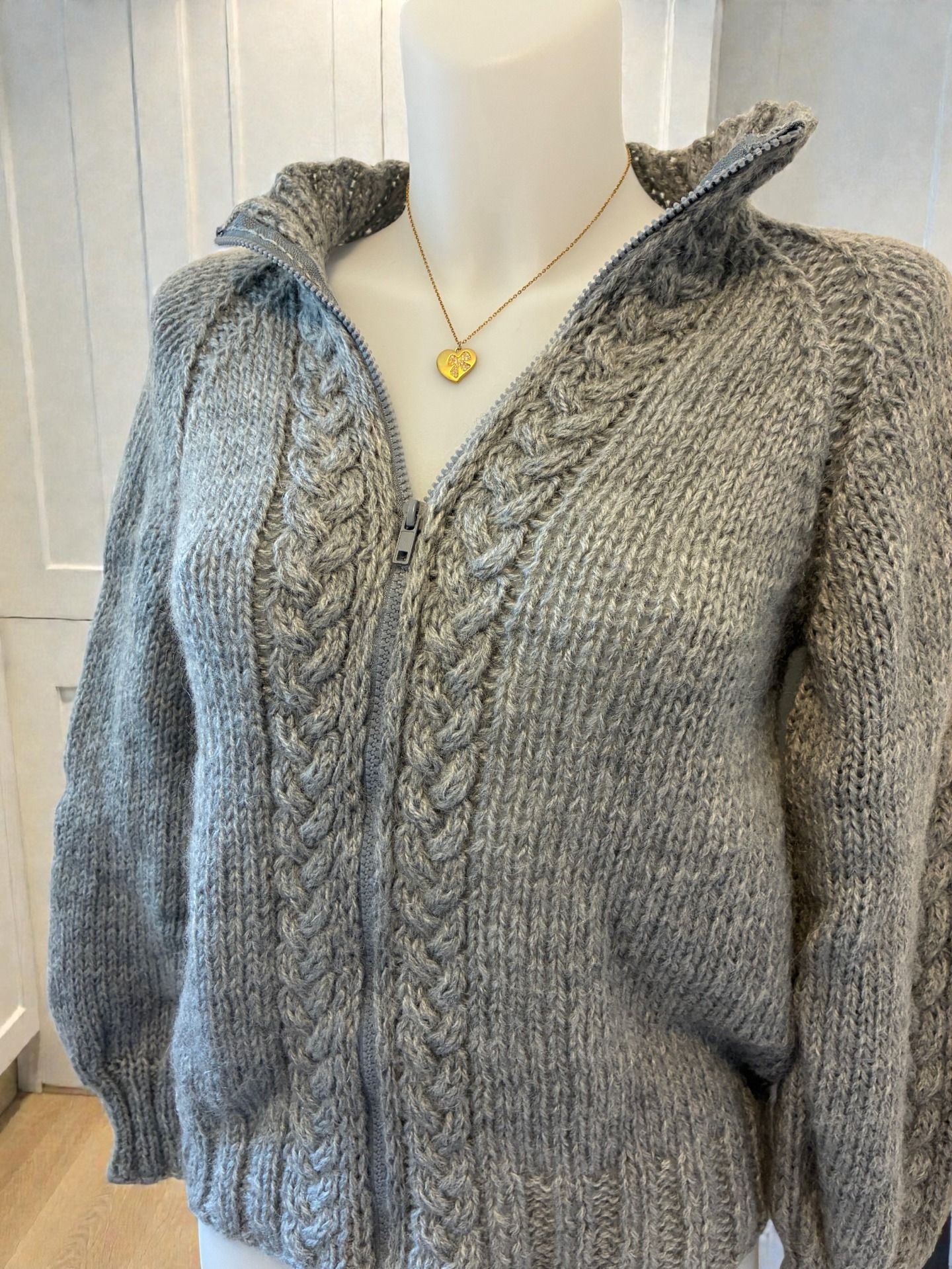 Gilet en maille grise fait main, col montant et zip central. Chaud et confortable pour les journées fraîches, facile à porter au quotidien. Taille FR 36/38 (S/M).