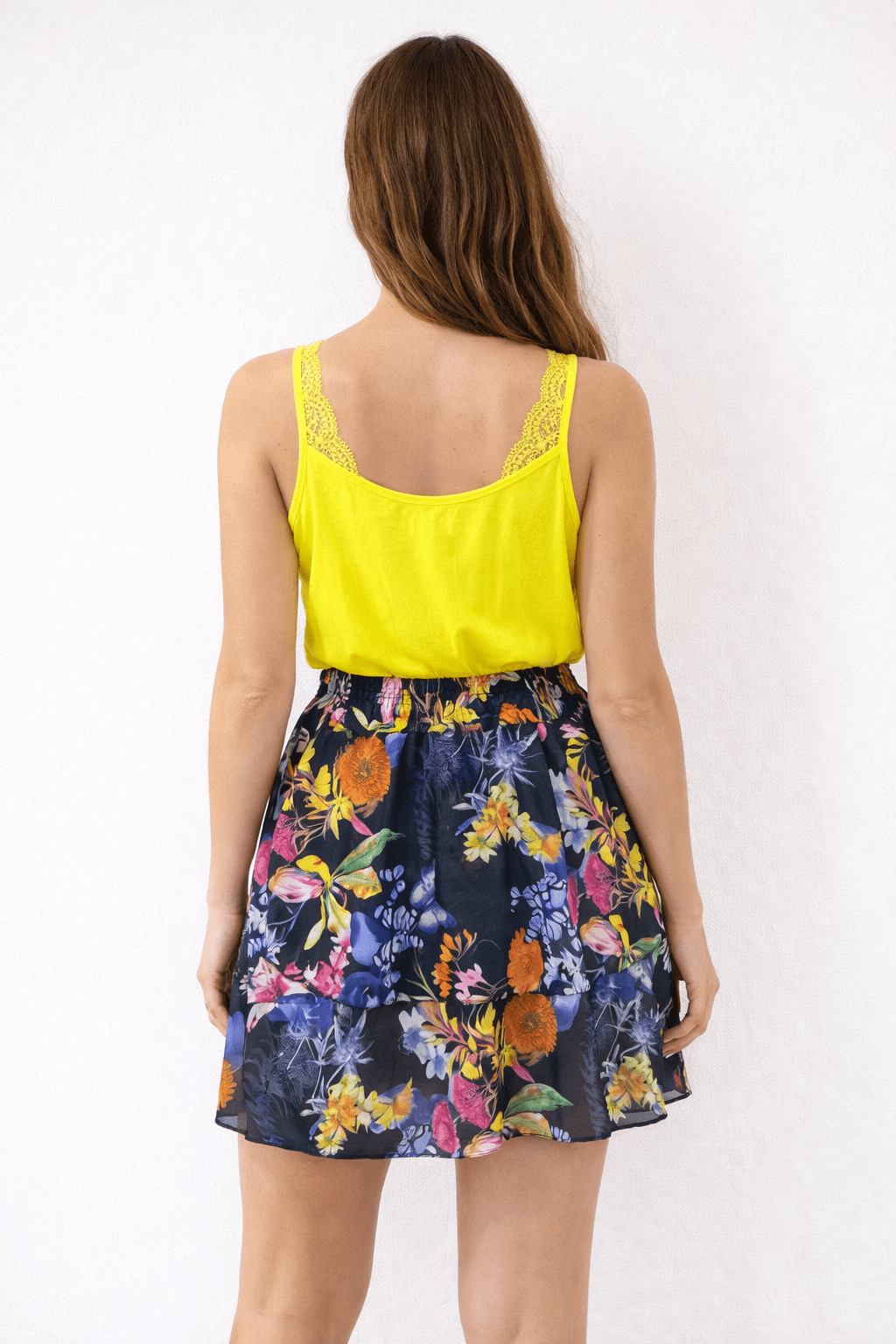 Jupe évasée imprimé floral sur fond noir, Made in Italy