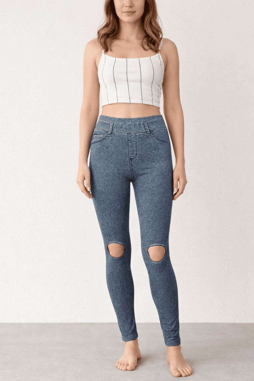 Legging effet jean extensible avec découpes aux genoux. Taille unique, 4 coloris au choix. 85% polyamide, 15% élasthanne.