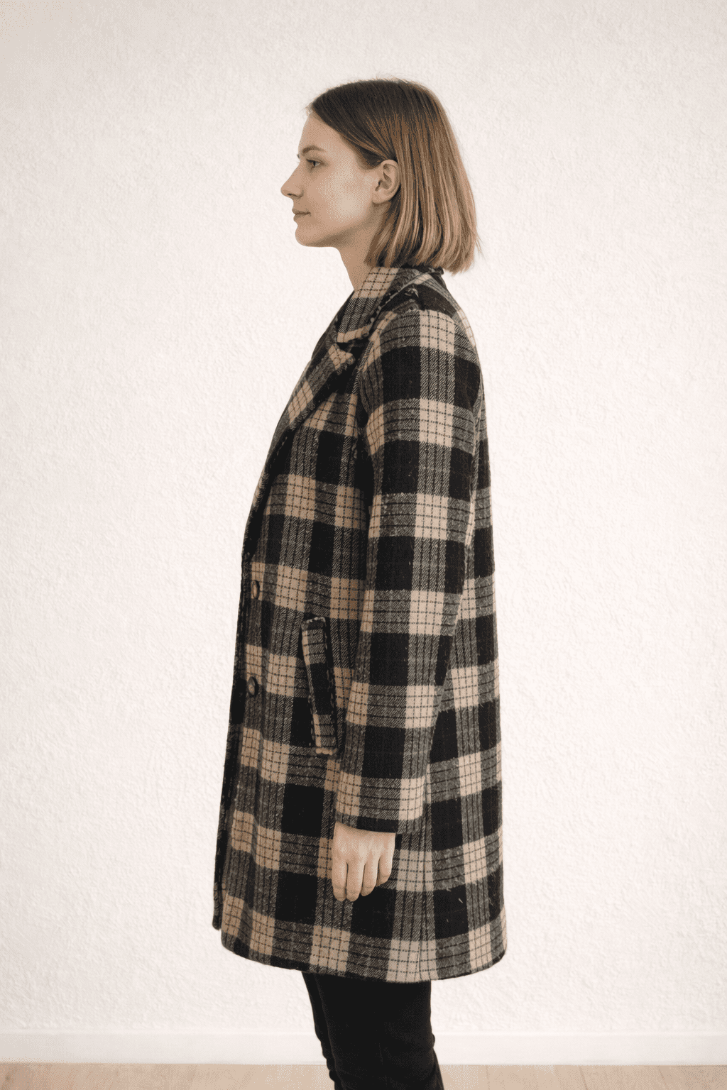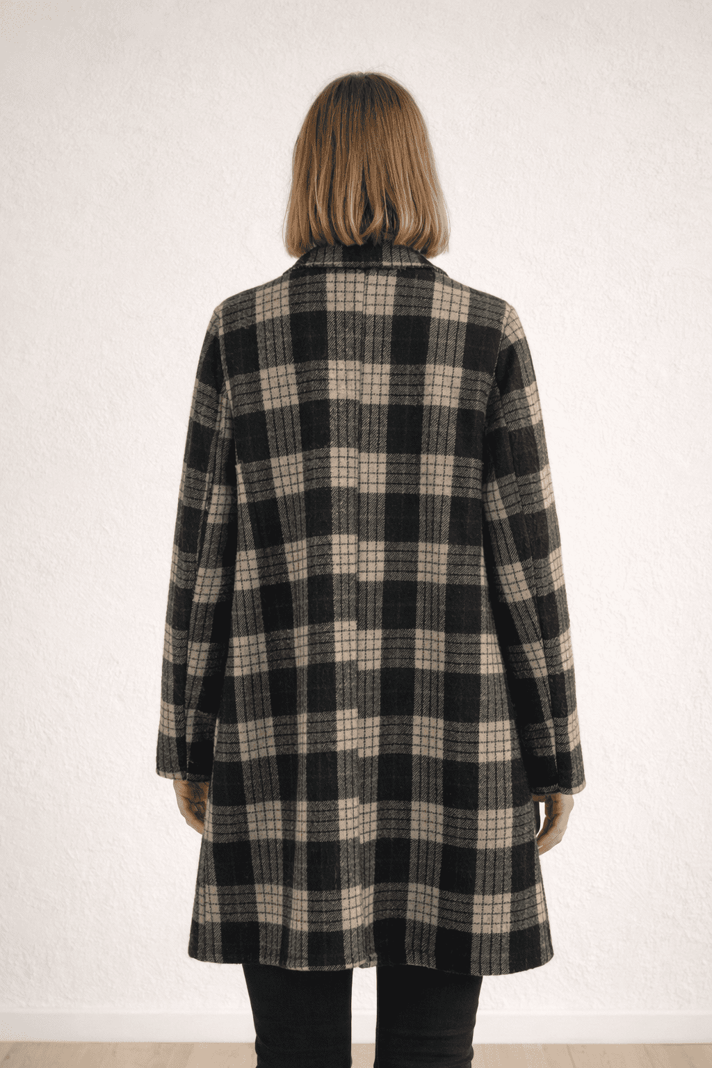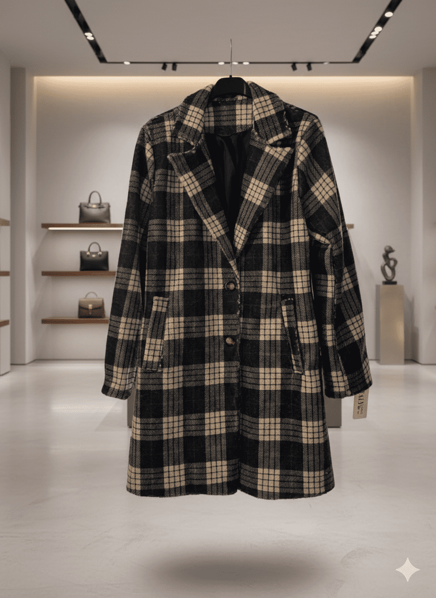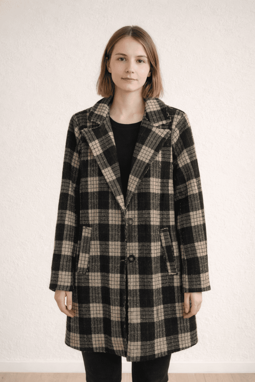 Manteau à carreaux noir & beige, doublé, made in Italie