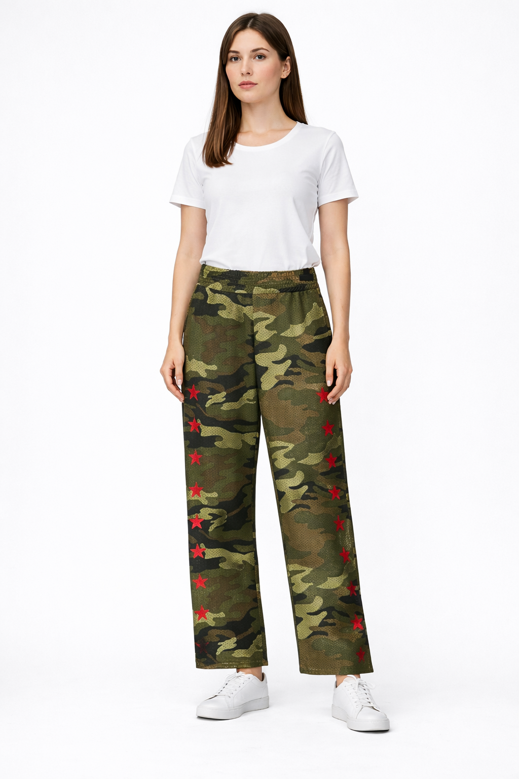 Pantalon long Odi et Amo en 100% polyester, imprimé camouflage avec étoiles rouges, taille élastique et matière ajourée à petits trous. Une pièce originale, au rendu légèrement transparent, pour un look affirmé.
