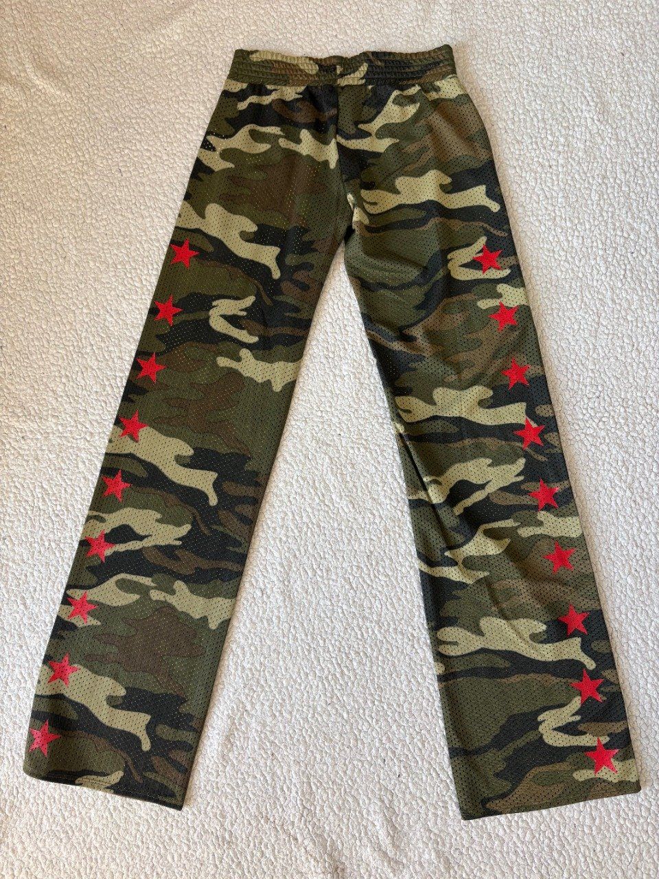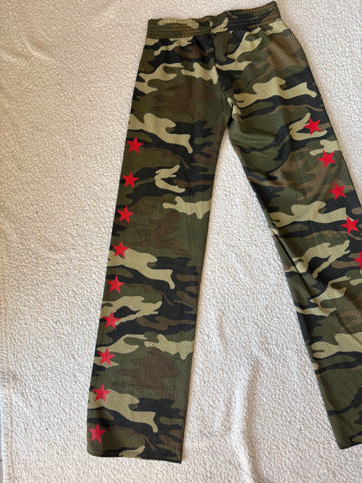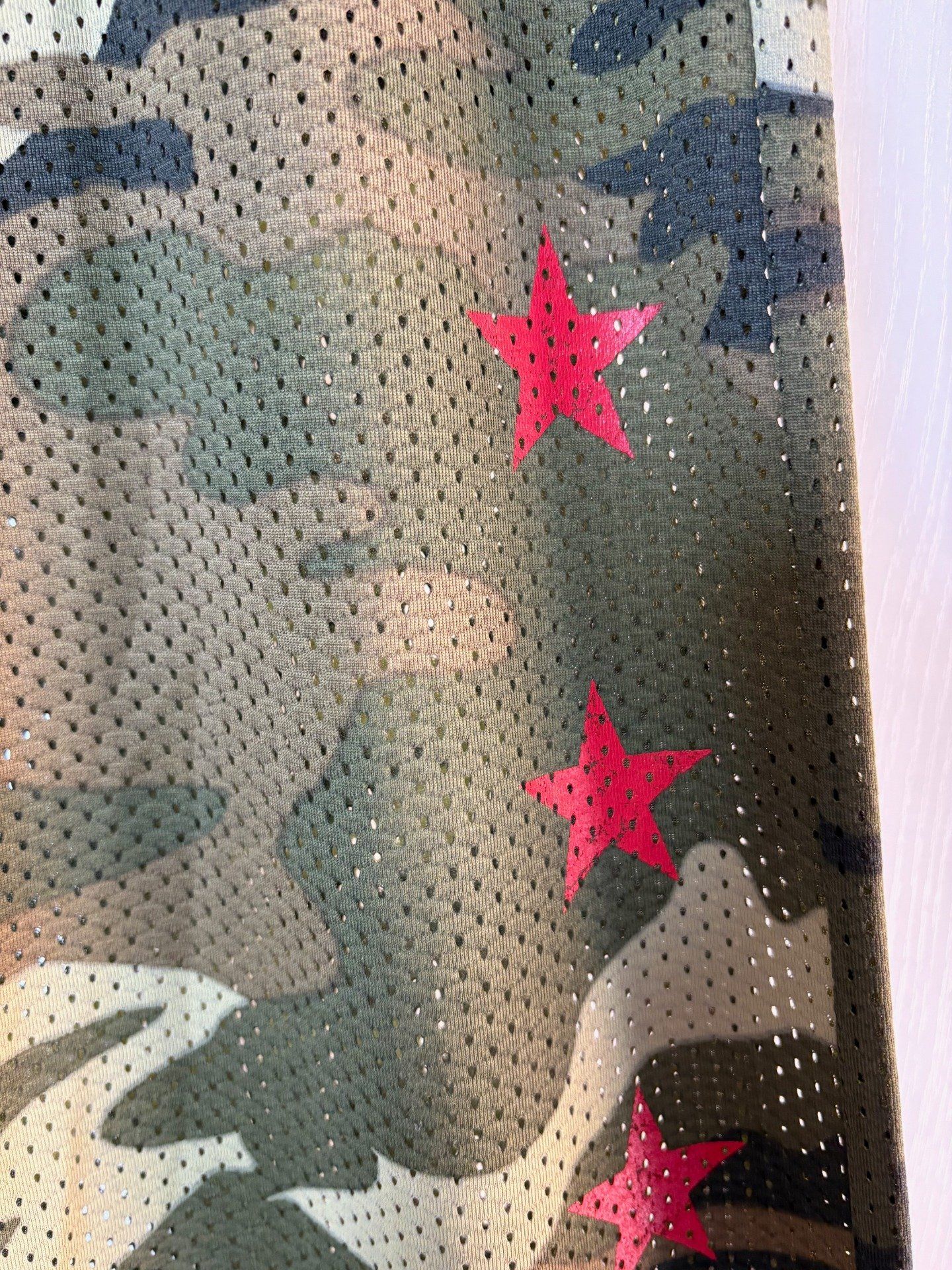 - Fermeture / détails : taille élastique, matière ajourée à petits trous, imprimé camouflage, étoiles rouges