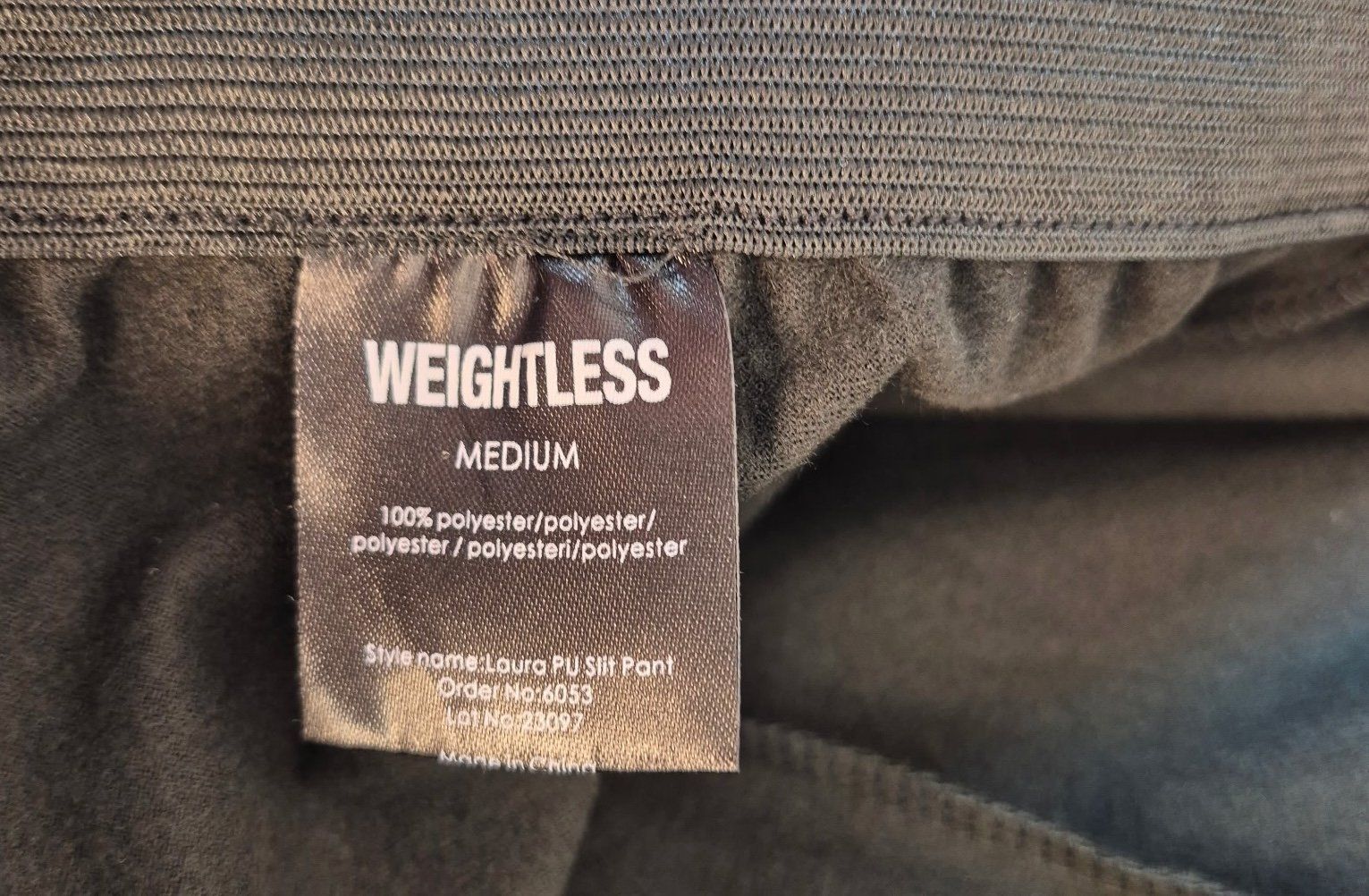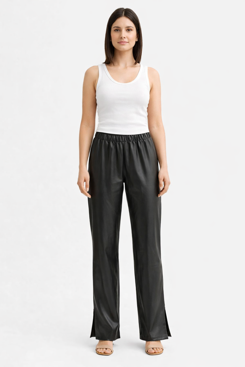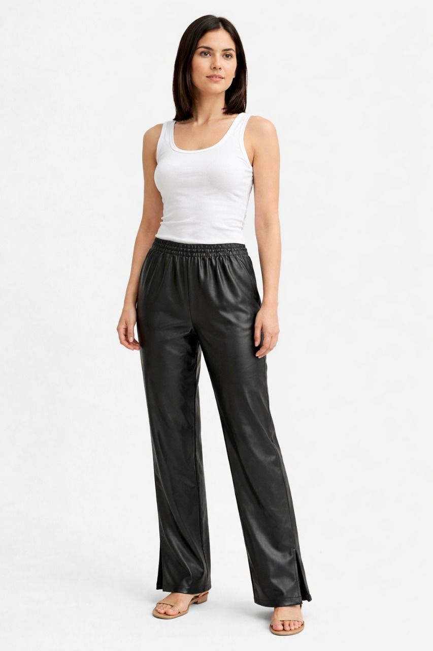 Pantalon noir Weightless à taille élastiquée, fini effet cuir et fentes discrètes en bas de jambe. Une pièce simple et actuelle, facile à associer au quotidien.