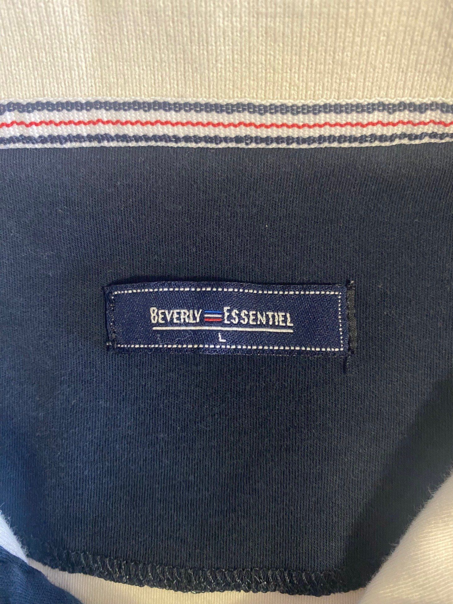 Polo homme “Saint Tropez” Beverly Essentiel en seconde main, très bon état. 100% coton, taille L. Style French Riviera avec finitions contrastées au col et aux manches. Pièce unique, photos réelles. Réf FIQBI.