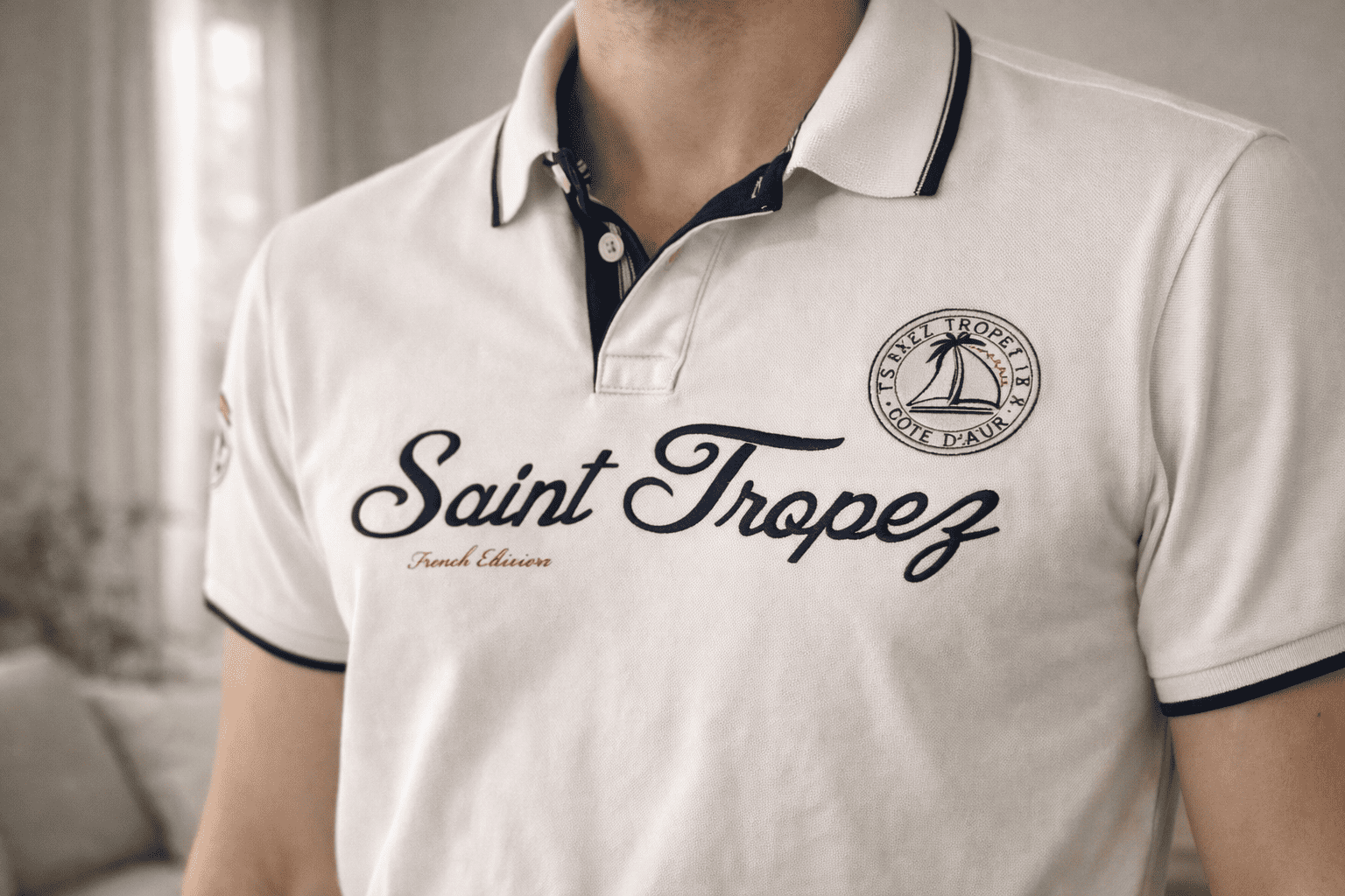 Polo homme style French Riviera avec marquage “Saint Tropez” sur la poitrine et finitions contrastées au col et aux manches. Confortable et respirant grâce à sa composition 100% coton. Facile à associer (jean, chino, short).