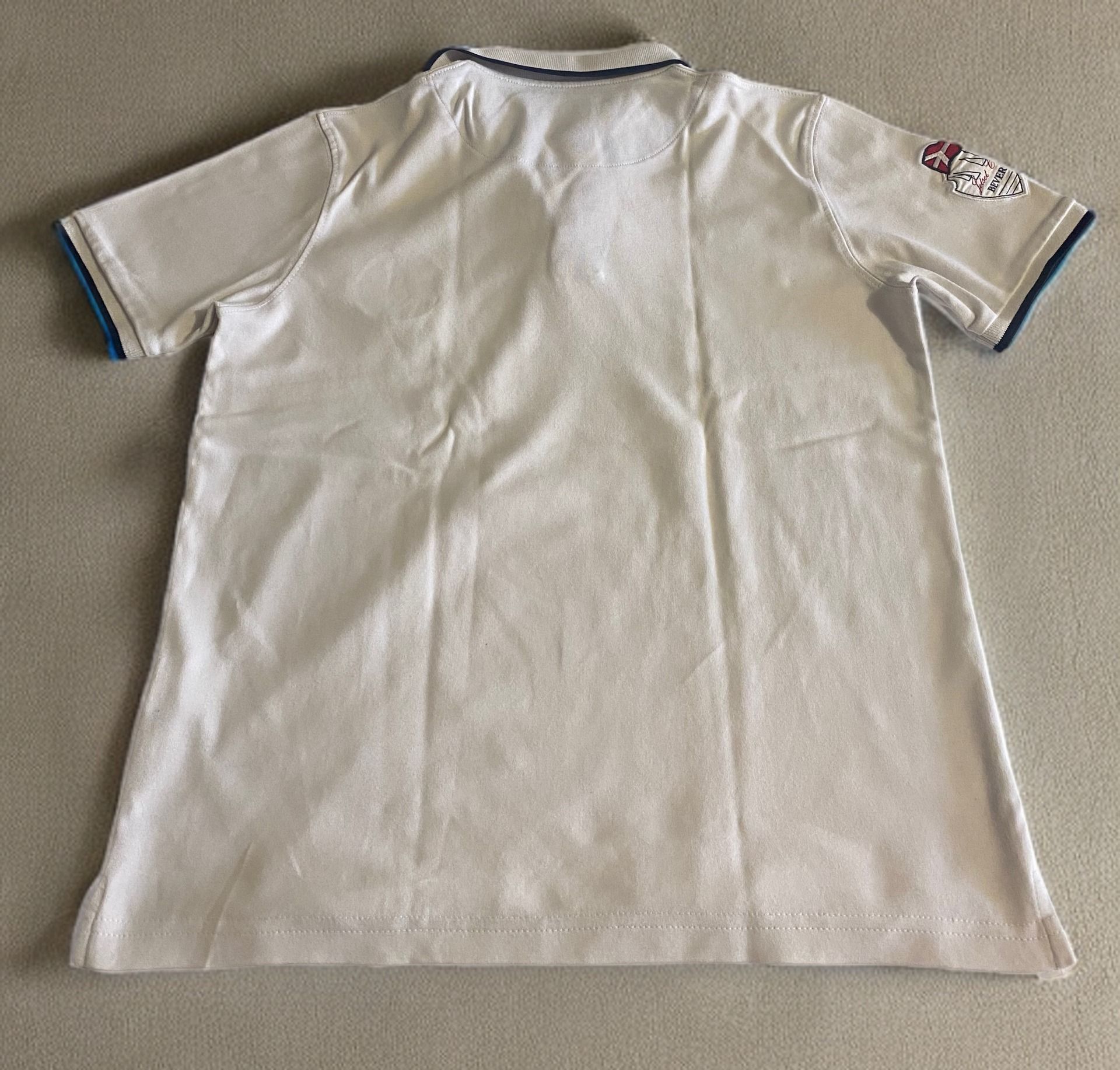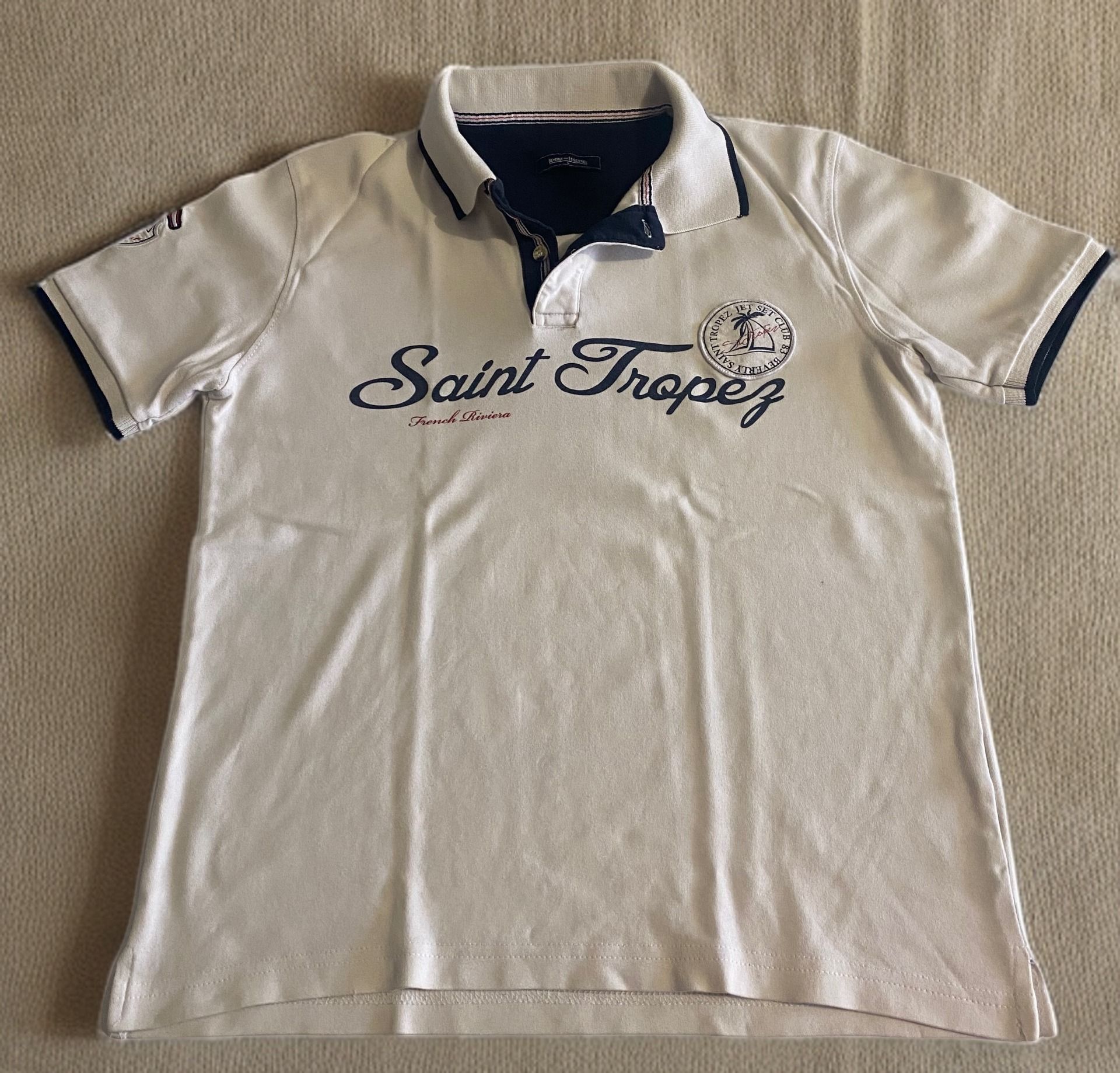 Polo homme “Saint Tropez” (Beverly Essentiel), 100% coton doux et respirant. Style French Riviera avec marquage poitrine et finitions contrastées col/manches. Facile à associer (jean, chino, short). Très bon état. Taille L. Réf : FIQBI.