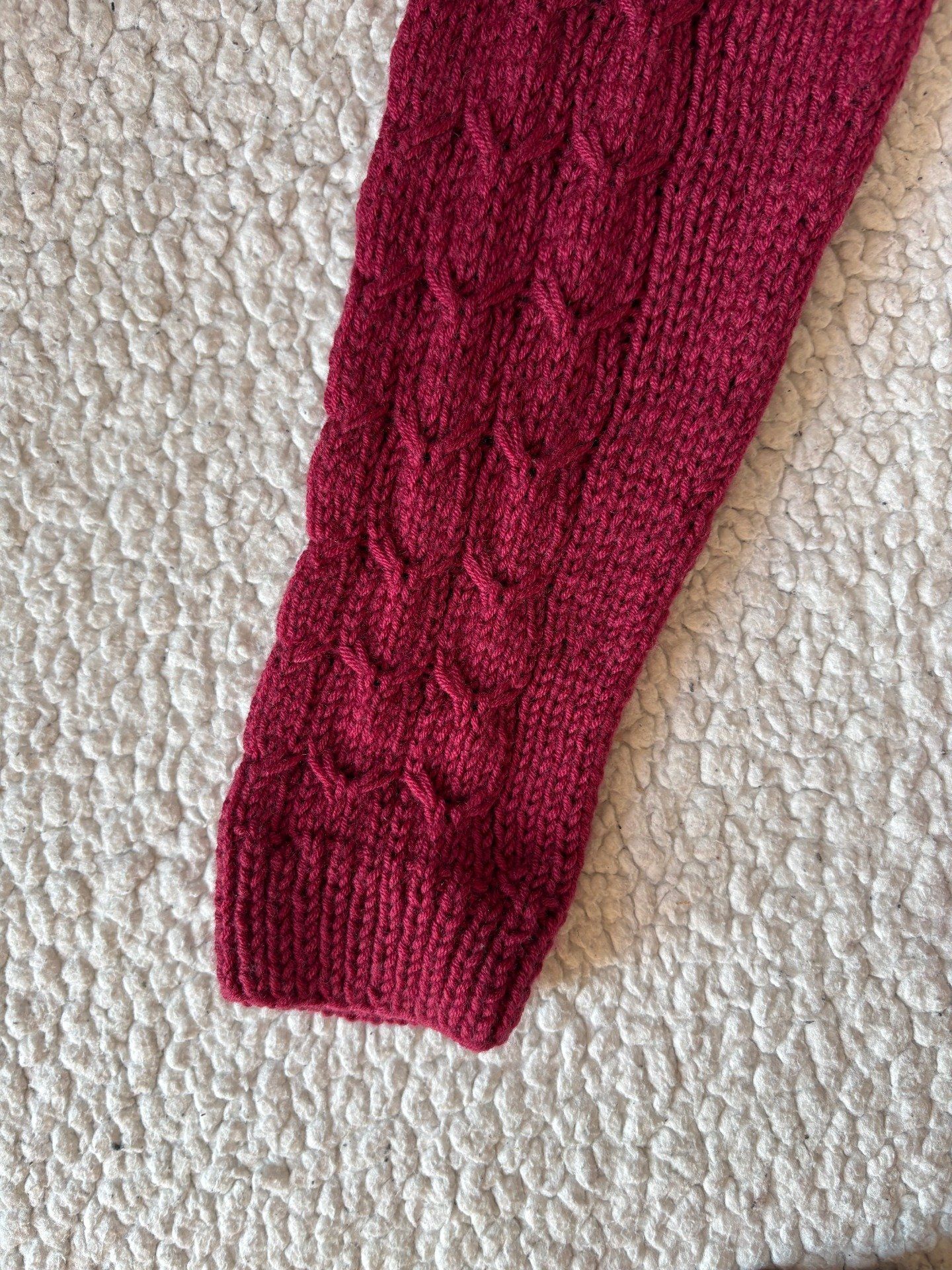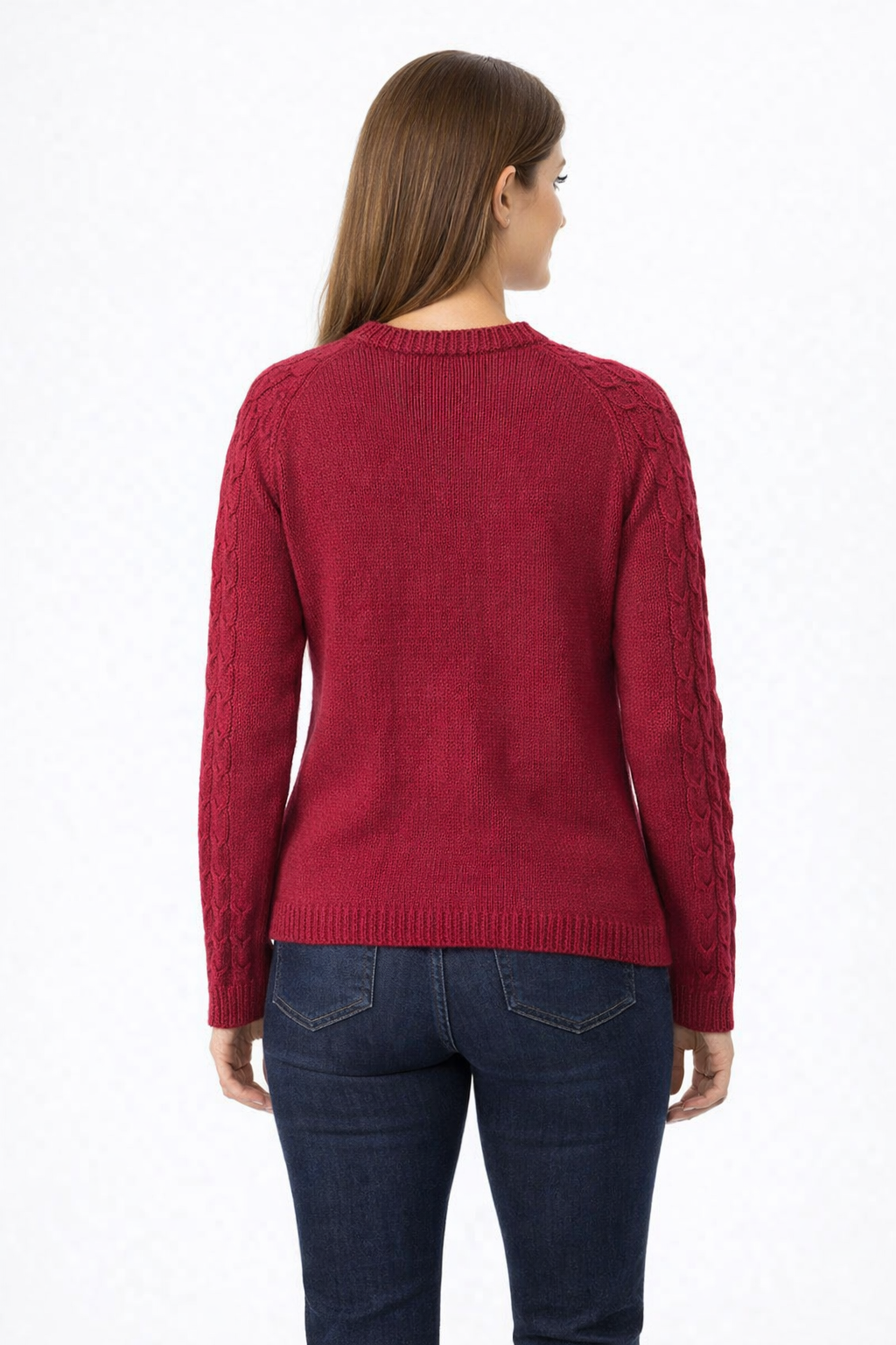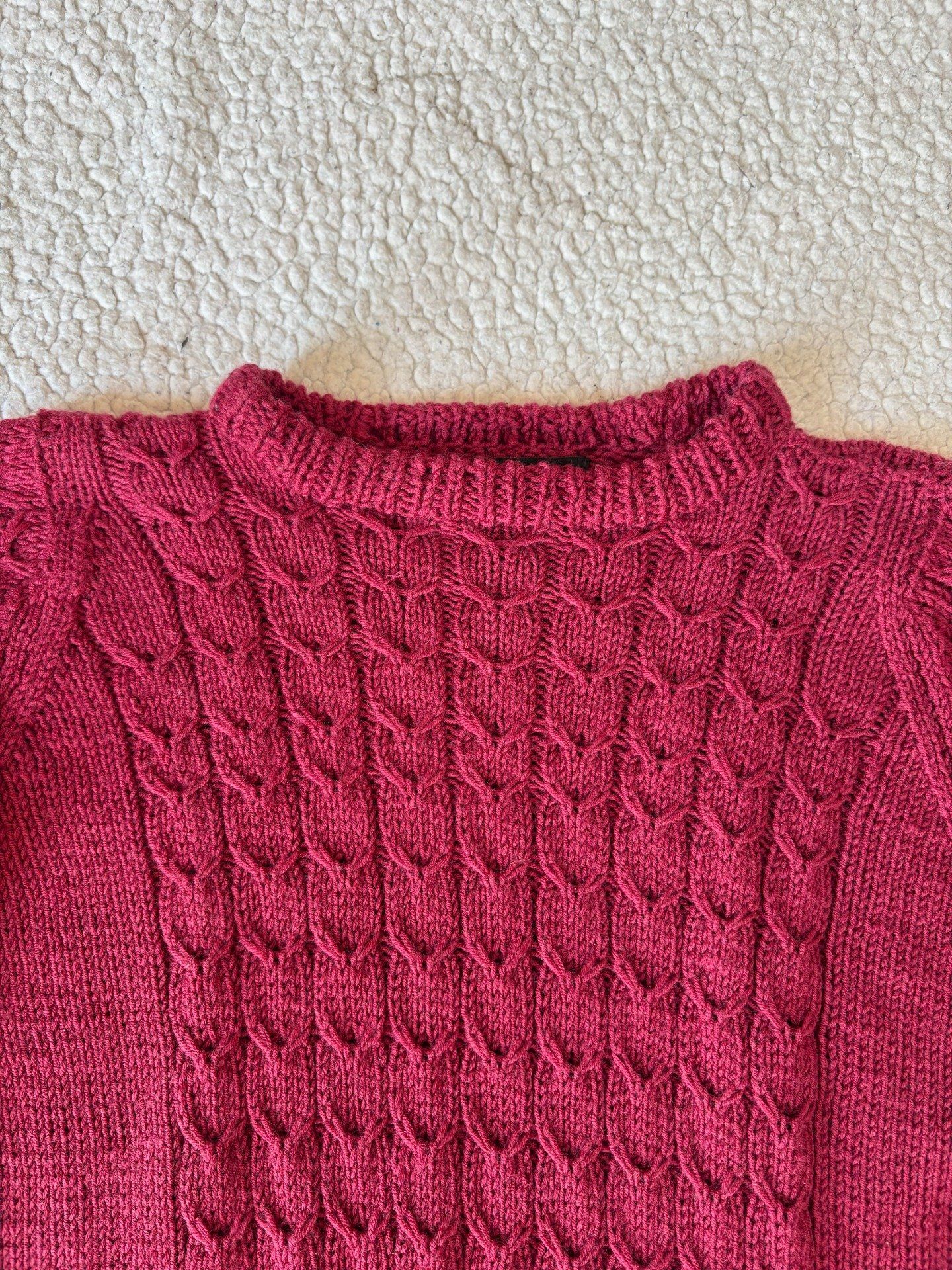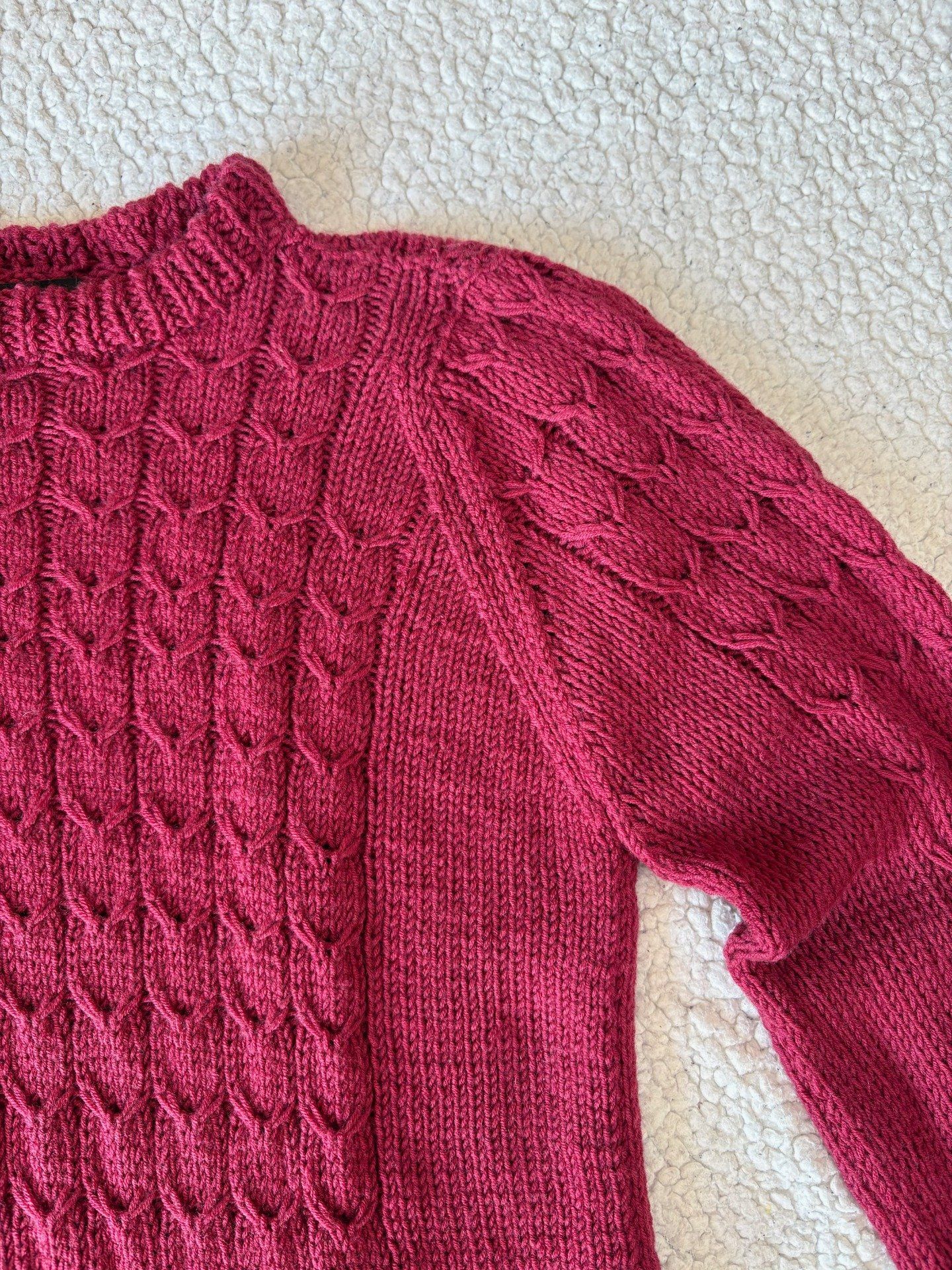 Pull fait main en France, en rouge framboise, avec maille relief travaillée. Composition 80% mérinos, 20% cachemire. Taille M / 38-40.