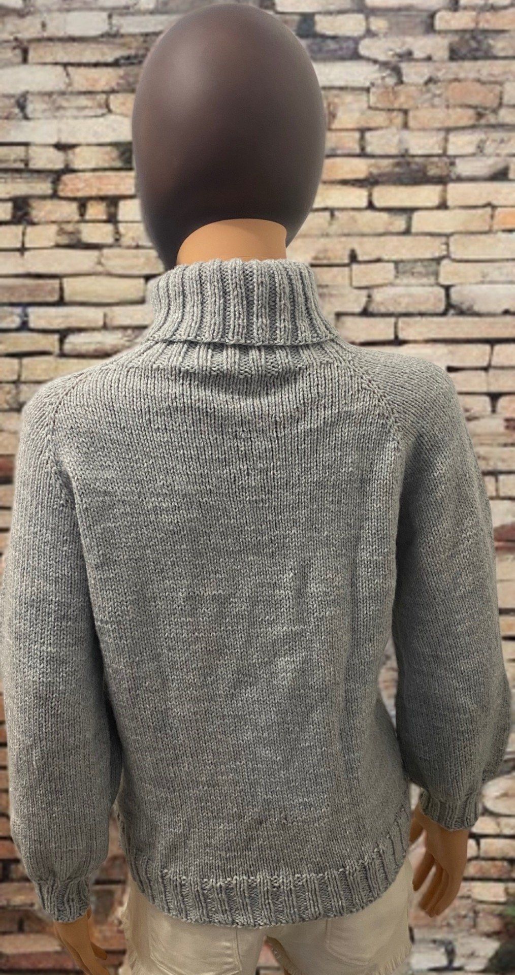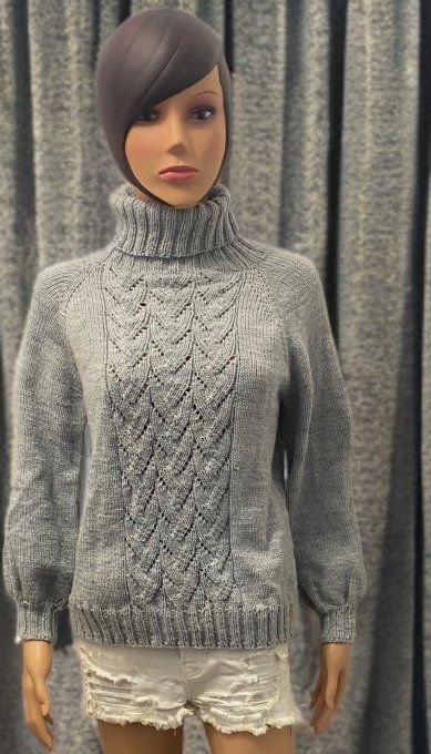Pull gris col roulé à maille travaillée, à la fois élégant et confortable. Son motif torsadé sur le devant et sa coupe intemporelle en font une pièce idéale pour un look chic et cosy au quotidien.