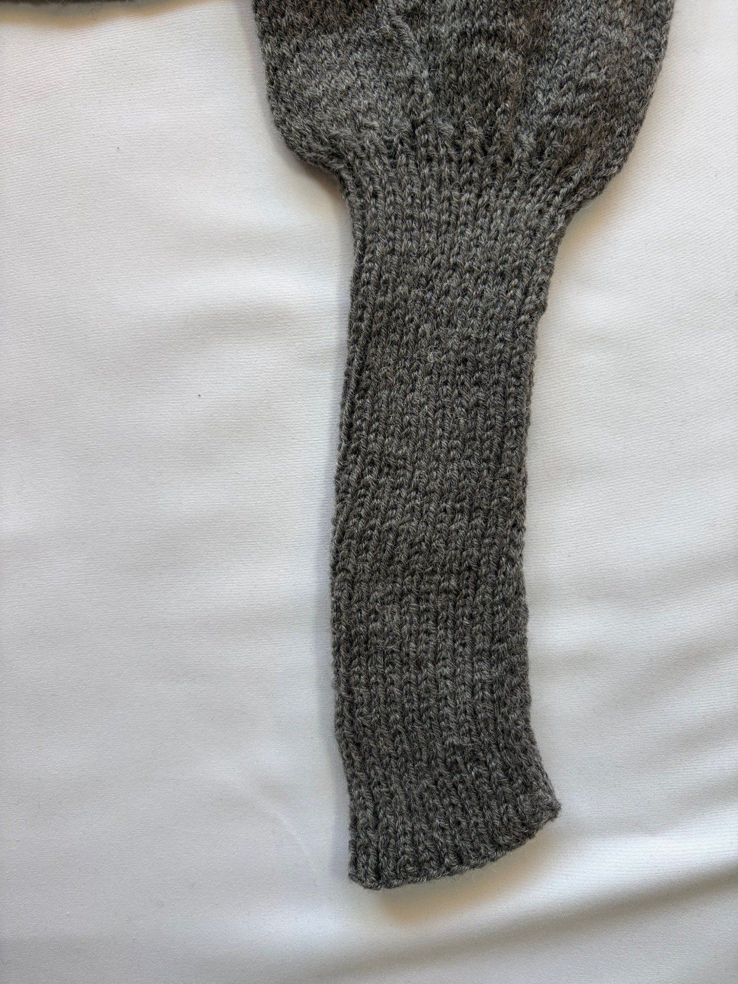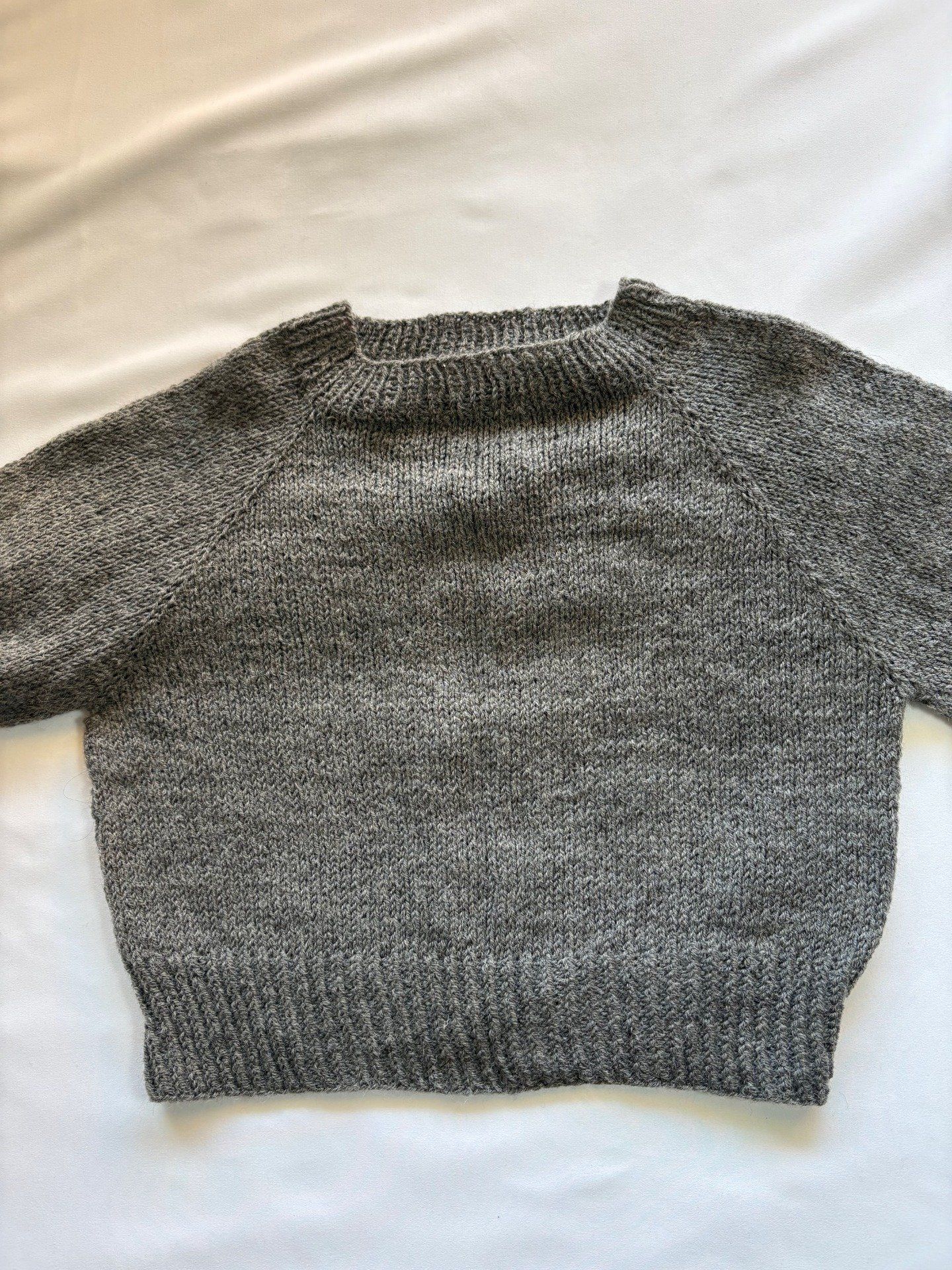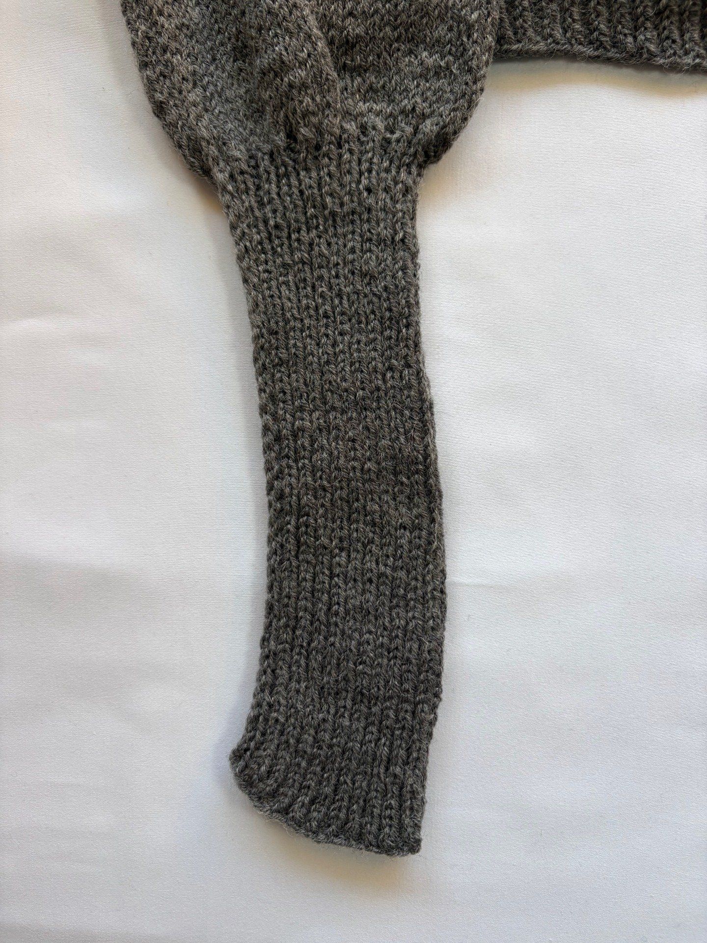 Pull maille grise fait main, col rond et manches bouffantes