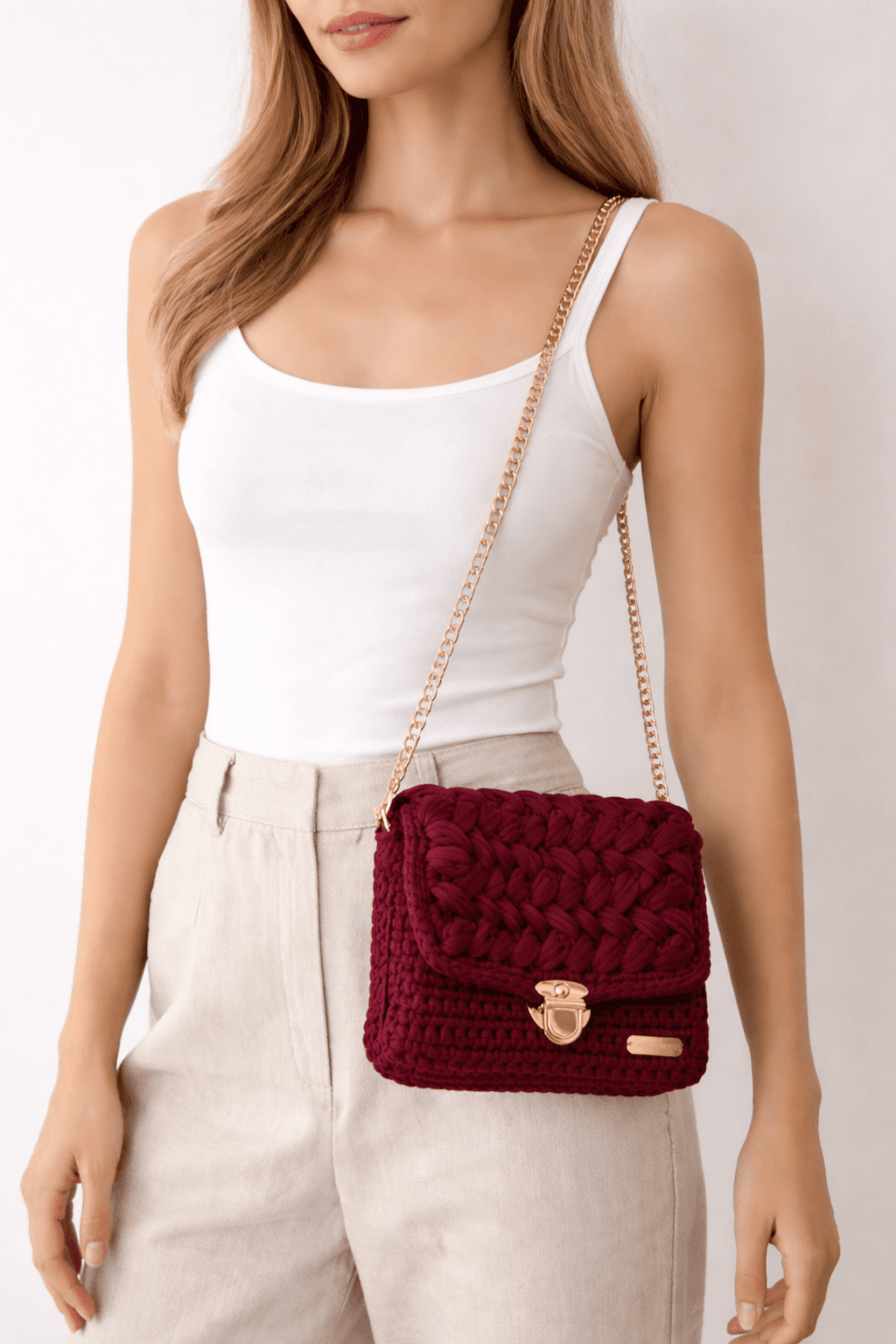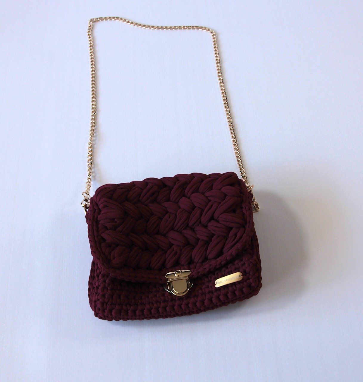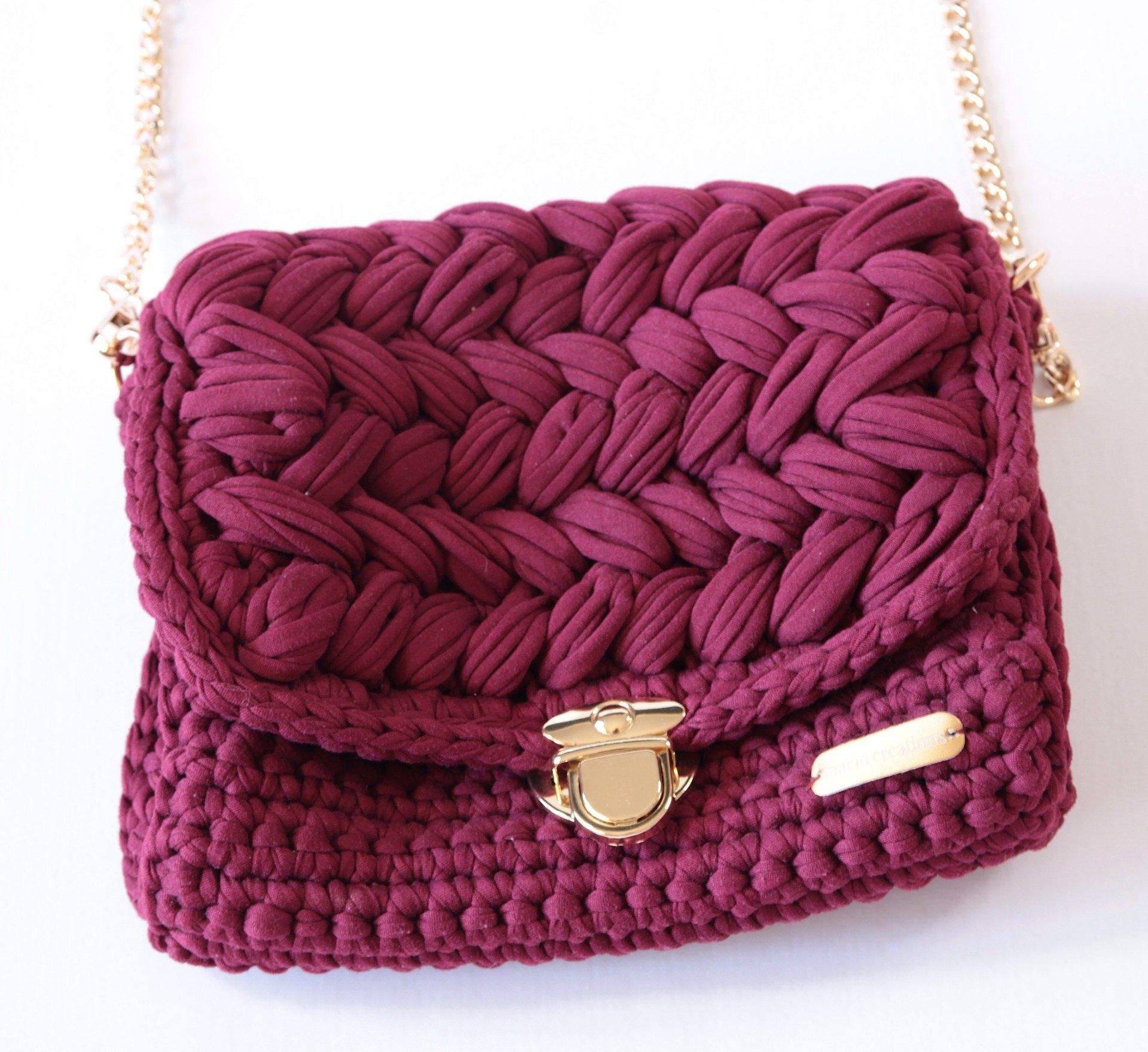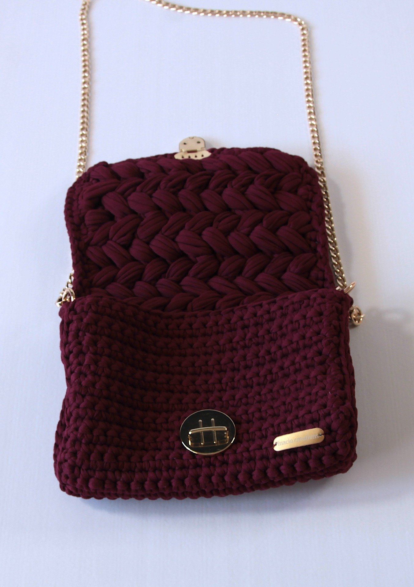 Sac bandoulière fait main au joli relief crocheté, en polyester coloris vin rouge, avec fermoir et chaîne dorés. Un modèle compact, soigné et élégant,
