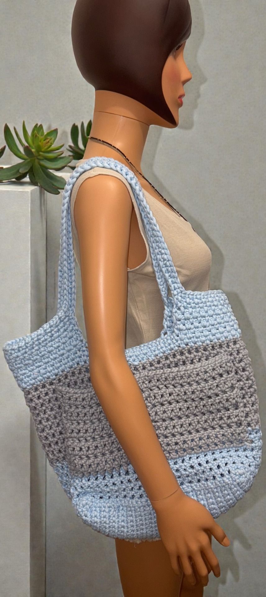 Sac cabas crocheté fait main, au design bicolore bleu ciel et gris, alliant souplesse, légèreté et praticité. Un modèle élégant et fonctionnel, idéal pour un usage quotidien, les balades ou les sorties détente.