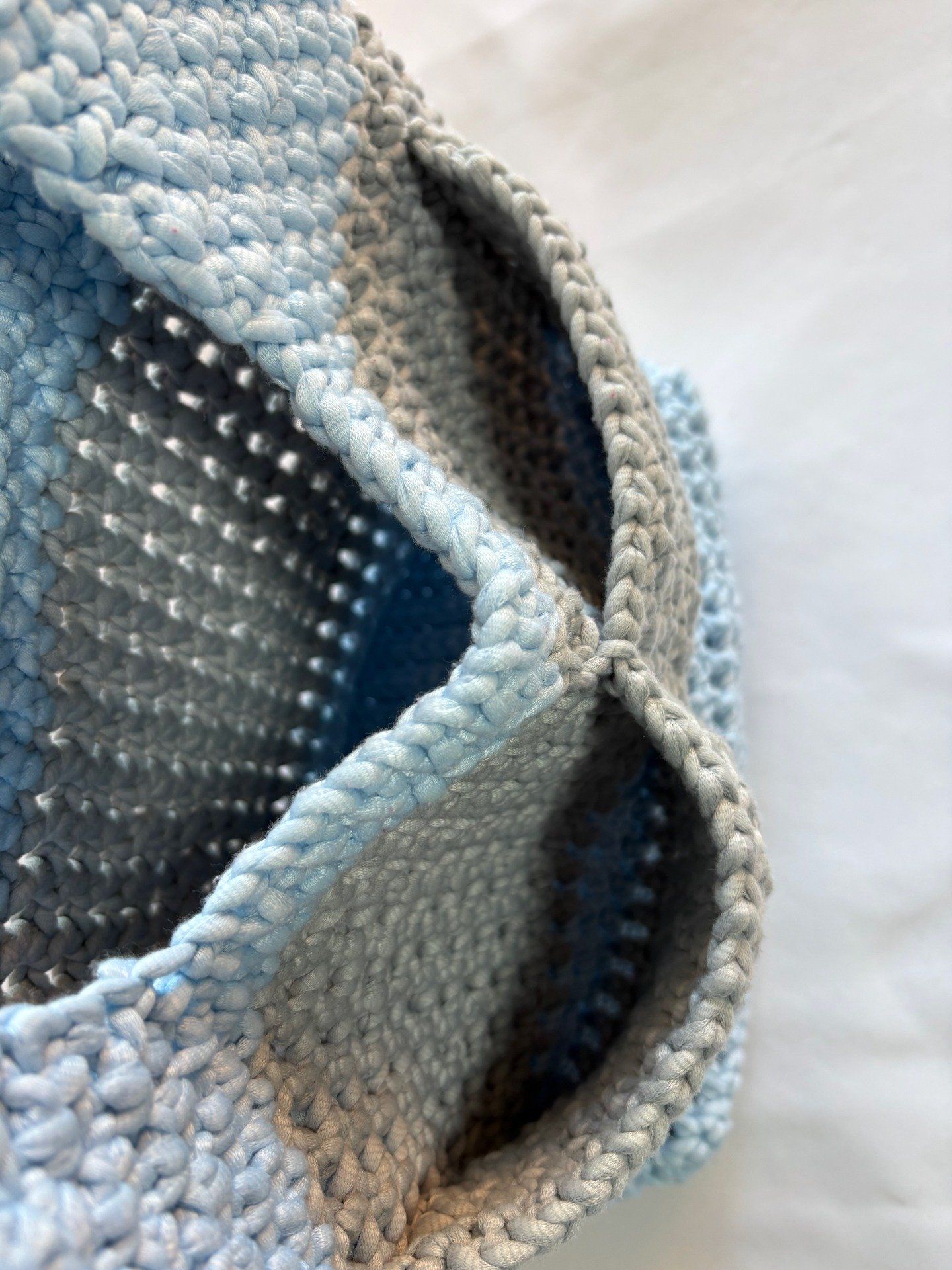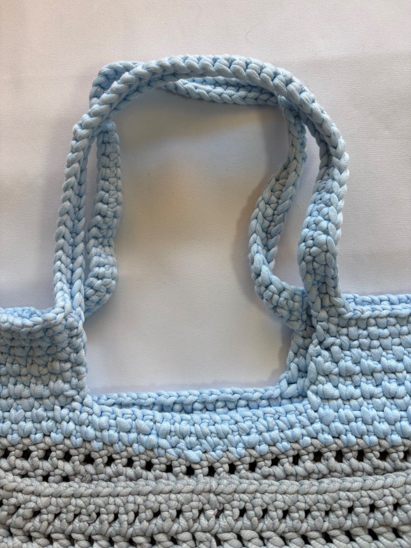 Sac cabas crocheté fait main, bicolore bleu ciel et gris. Souple, léger, pratique au quotidien, idéal pour vos essentiels. Taille unique, porté main ou épaule.