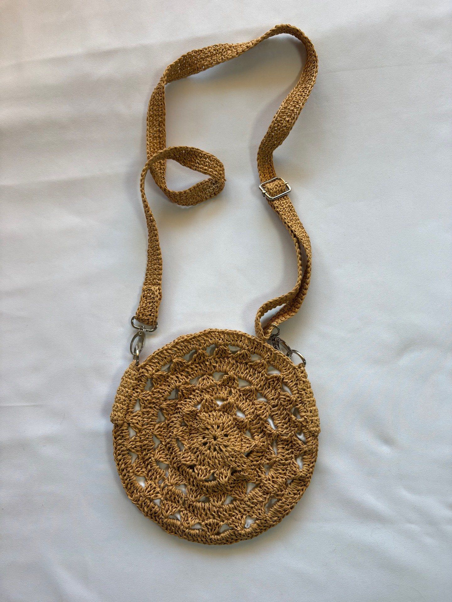 Sac rond femme en raphia au crochet fait main, camel naturel. Bandoulière confortable, intérieur doublé avec fermeture zippée pour l’essentiel. Taille unique