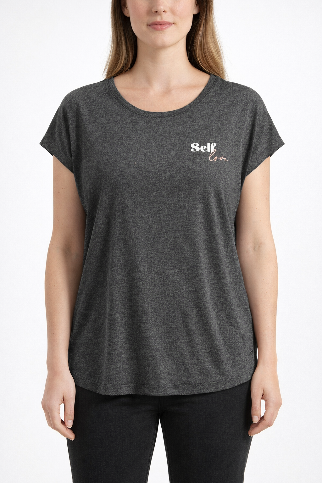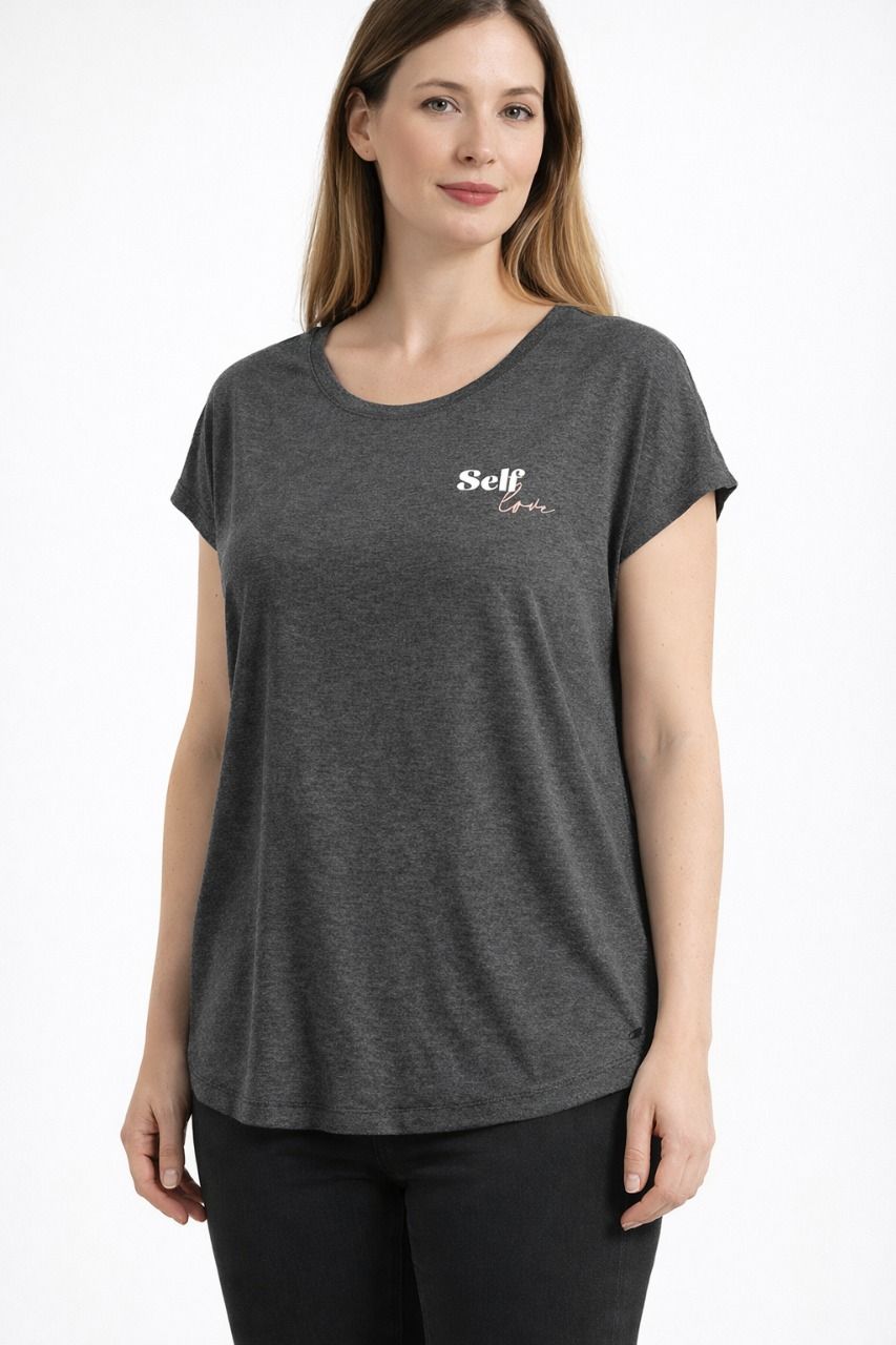 - Fermeture / détails : Encolure ronde, manches courtes, imprimé poitrine “Self love”, base légèrement arrondie