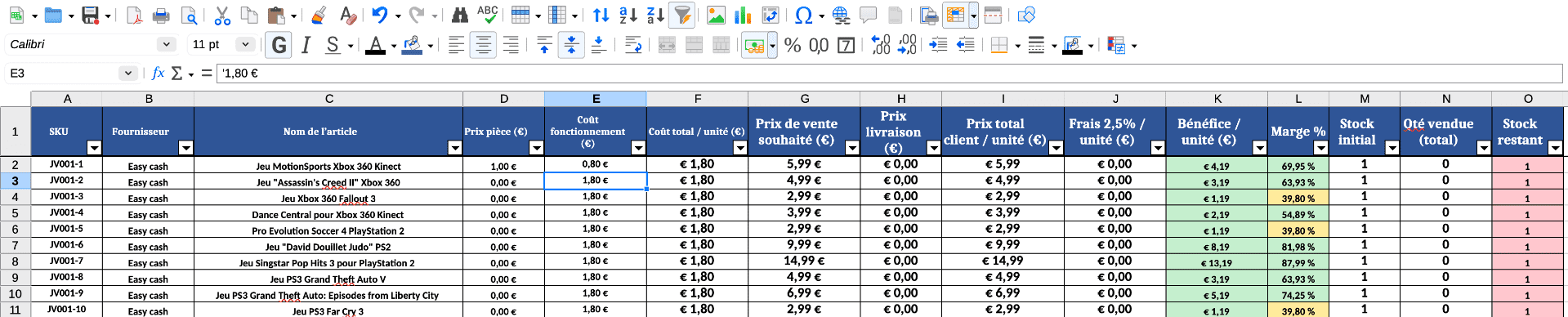 Le fichier est un tableau de gestion de stock et de ventes spécialement conçu pour les auto-entrepreneurs,