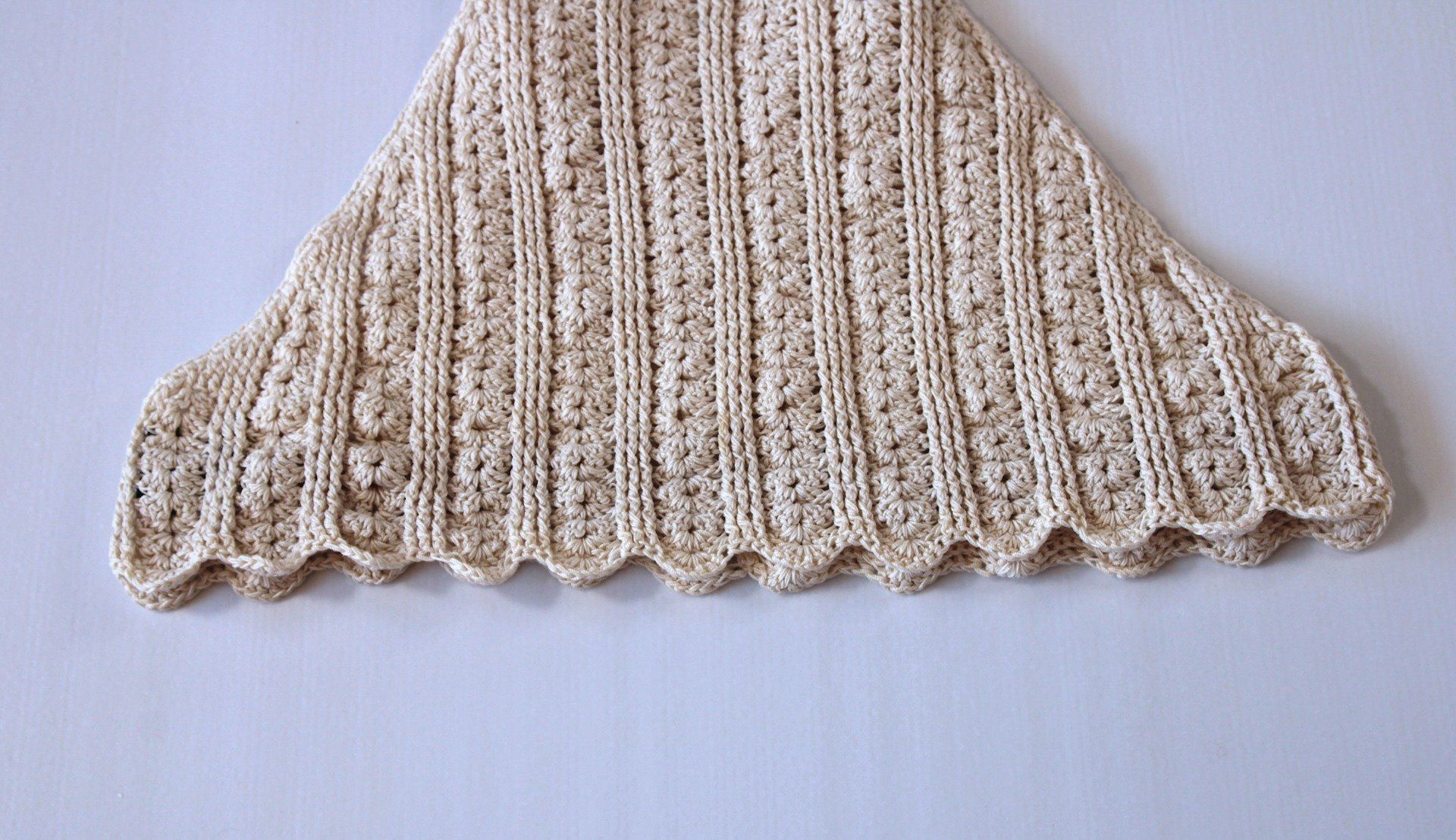 Cette pièce se distingue par son travail au crochet, sa bordure festonnée et ses liens à nouer qui lui donnent une belle présence.