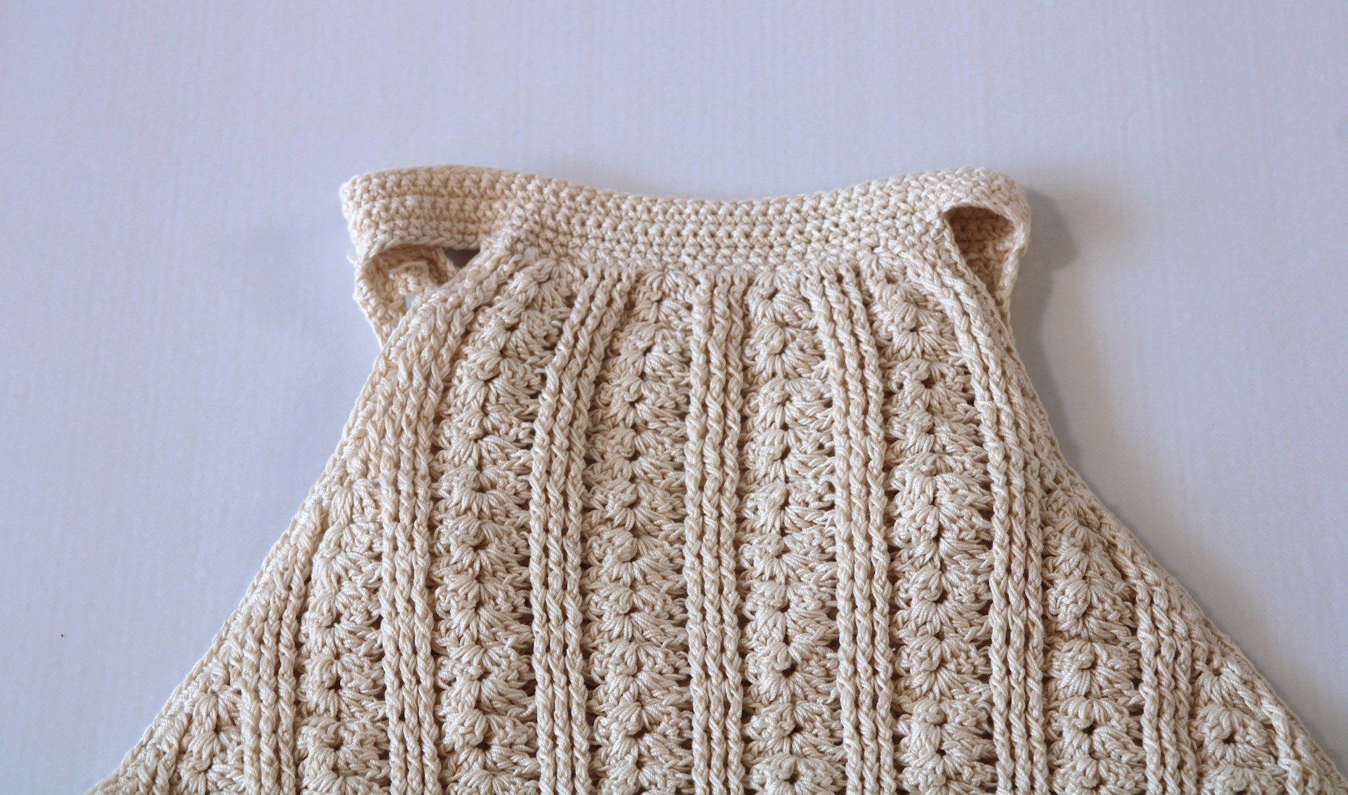 Top dos nu en crochet beige 100% coton signé Inacio Creations, avec liens à pompons et jolie bordure festonnée.
