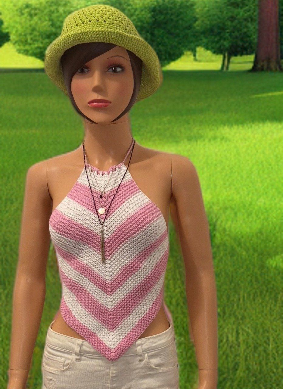 Top triangle en maille tricotée rose et écru, léger et confortable. Coupe flatteuse, style bohème, parfait pour l’été. Taille S/M – Correspondance française 36/38.