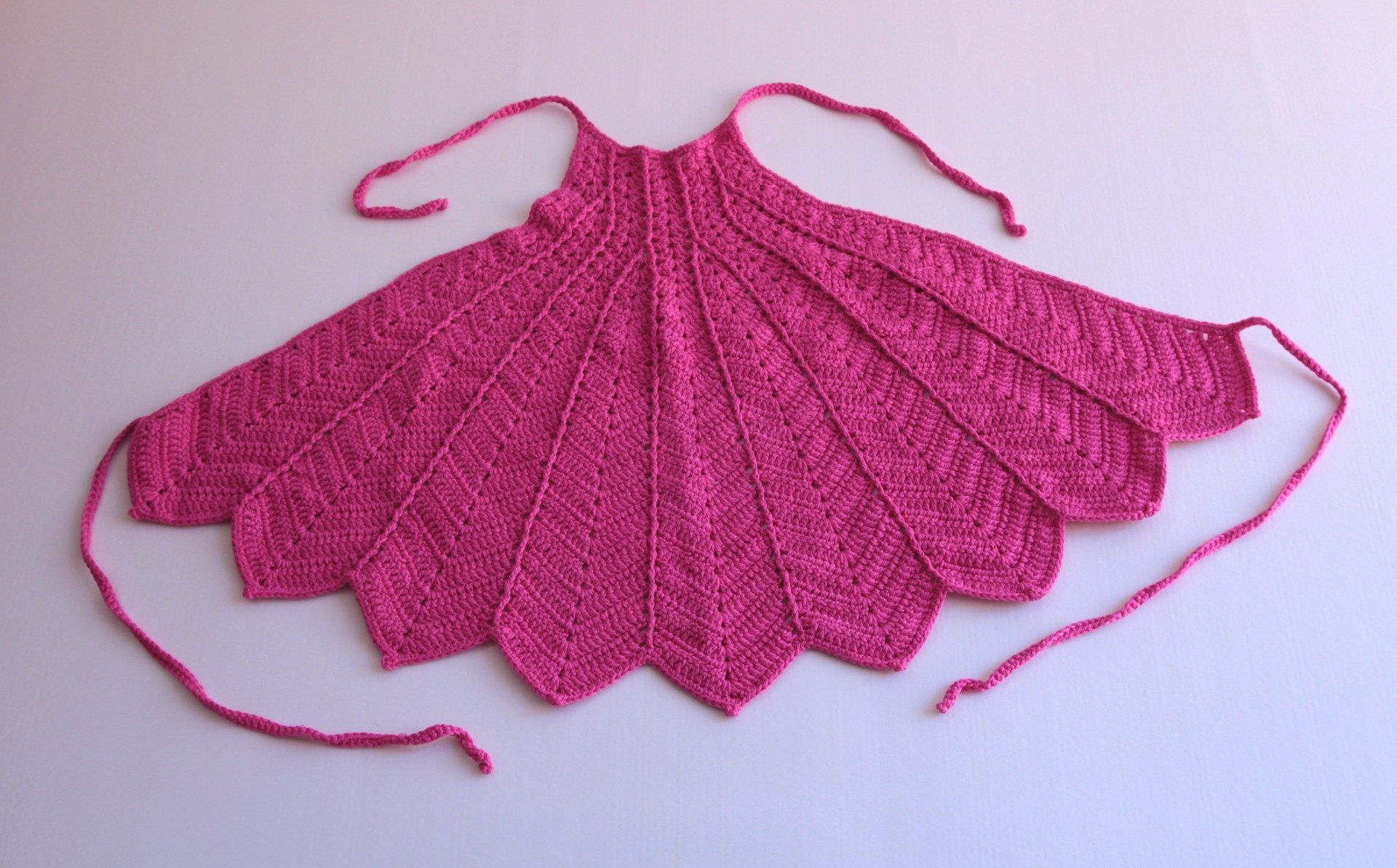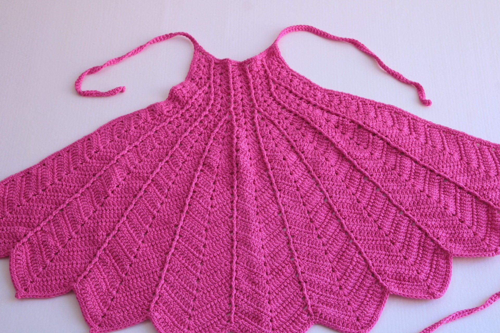 Top triangle tricoté fait main en fuchsia, avec une jolie maille ajourée et des liens à nouer pour un ajustement facile.